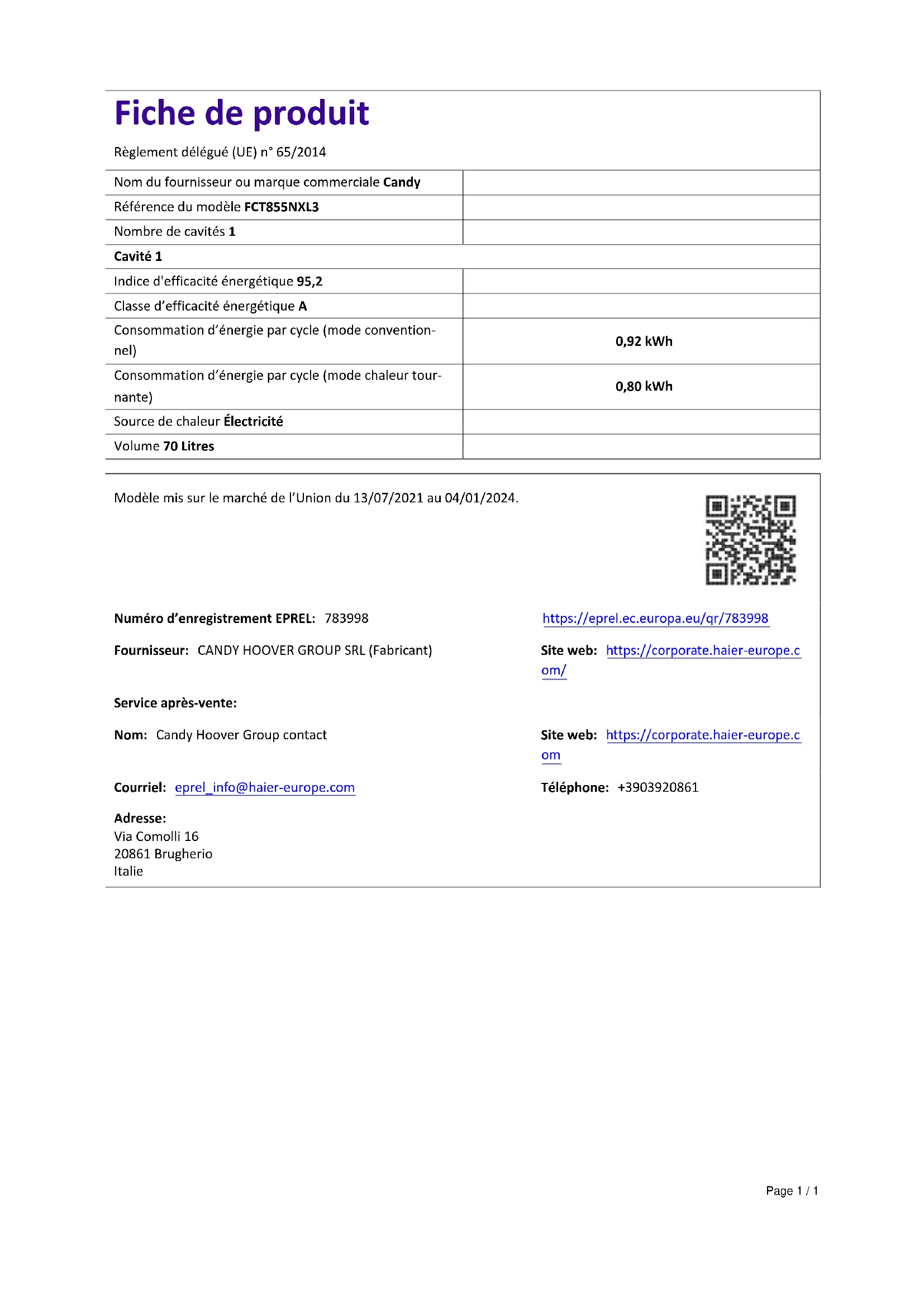 Fiche de produit Règlement délégué (UE) n° 65/2014 Nom du fournisseur ou marque commerciale Candy Référence du modèle FCT855NXL3 Nombre de cavités 1 Cavité 1 Indice d'efficacité énergétique 95,2 Classe d’efficacité énergétique A Consommation d’énergie par cycle (mode convention- nel) 0,92 kWh Consommation d’énergie par cycle (mode chaleur tour- nante) 0,80 kWh Source de chaleur Électricité Volume 70 Litres Modèle mis sur le marché de l’Union du 13/07/2021 au 04/01/2024. Numéro d’enregistrement EPREL: 783998 https://eprel.ec.europa.eu/qr/783998 Fournisseur: CANDY HOOVER GROUP SRL (Fabricant) Site web: https://corporate.haier-europe.c om/ Service après-vente: Nom: Candy Hoover Group contact Site web: https://corporate.haier-europe.c