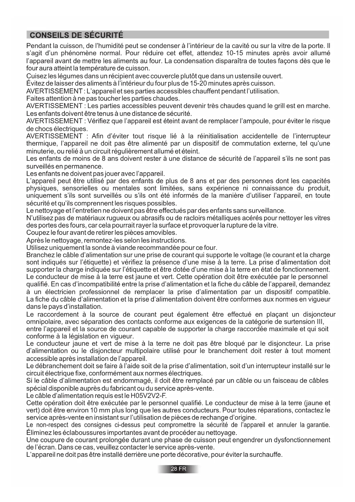 les jeunes enfants à l’écart de l’appareil. Lors de l’insertion du plateau de grille, faites attention à ce que le bord antidérapant soit positionné vers l’arrière et vers le haut. 29 FRCet appareil est conçu pour cuire des aliments. Tout autre utilisation (exemple chauffage d’appoint) doit être considéré comme impropre. Le constructeur ne peut être tenu comme responsable en cas de dommages liés à une mauvaise utilisation ou a des modifications techniques du produit. L’emploi d’un appareil électrique nécessite quelques règles de sécurité. - Ne pas tirer sur le fil électrique pour débrancher la prise. -Ne pas toucher l’appareil avec les pieds ou les mains mouillés. -Evitez d’utiliser l’appareil pieds nus. L’utilisation de multiprises et de rallonges pour raccorder votre appareil est fortement déconseillé. En cas de panne ou de mauvais fonctionnement il faut éteindre le four avant de le démonter. En cas de détérioration du fil électrique, remplacez-le rapidement en suivant les indications suivantes: ôtez le fil d’alimentation électrique et remplacez-le par un (du type H05V2V2F) adapté à la puissance de l’appareil. Vous veillerez à ce que cette opération soit effectuée par un centre technique agréé. Pour l’utilisateur c’est la certitude d’obtenir des pièces de rechange d’origine. Le non-respect de ces règles peut compromettre la sécurité de l’appareil.