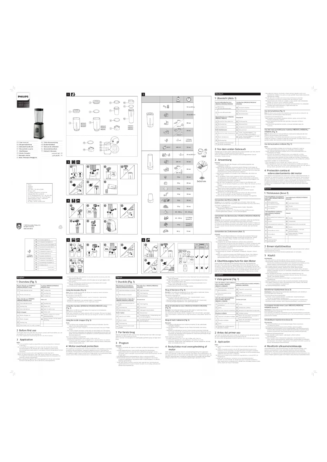 - Moudre des ingrédients secs comme des grains de poivre, des graines de sésame, du riz, du blé, de la noix de coco, des noix, des grains de café, des graines de soja séchées, des pois secs, du fromage, de la chapelure, etc. 4 Protection anti-surchauffe du moteur Cet appareil est équipé d'une protection anti-surchaue. Lorsque l'appareil est en surchaue, il se met automatiquement hors tension. Débranchez l'appareil et laissez-le refroidir pendant 30 minutes. Rebranchez ensuite l'appareil sur la prise secteur et rallumez-le. Veuillez contacter votre revendeur Philips ou un Centre Service Agréé Philips si la protection anti-surchaue s'active trop souvent. Italiano 1 Panoramica (Fig. 1) Vaso frullatore in plastica (solo HR2603/HR2604/HR2607) Bicchiere (solo HR2603/HR2604/ HR2605)