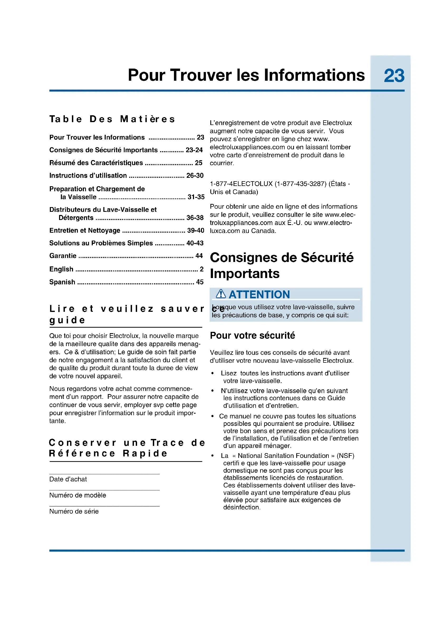 - Lisez toutes les instructions avant d’utiliser votre lave-vaisselle.• N’utilisez votre lave-vaisselle qu’en suivant les instructions contenues dans ce Guide d’utilisation et d’entretien.• Ce manuel ne couvre pas toutes les situations possibles qui pourraient se produire. Utilisez votre bon sens et prenez des précautions lors de l’installation, de l’utilisation et de l’entretien d’un appareil ménager.• La « National Sanitation Foundation » (NSF) certifi e que les lave-vaisselle pour usage domestique ne sont pas conçus pour les établissements licenciés de restauration. Ces établissements doivent utiliser des lave-vaisselle ayant une température d’eau plus élevée pour satisfaire aux exigences de désinfection. C o n s e r v e r u n e Tr a c e d e R é f é r e n c e R a p i d e Pour votre sécurité24 Consignes de Sécurité Importants