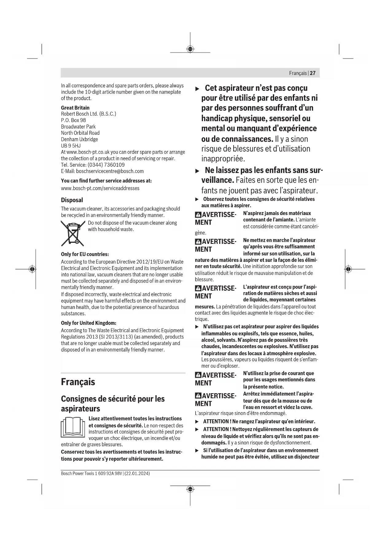 After-Sales Service and Application Service Our after-sales service responds to your questions concern- ing maintenance and repair of your product as well as spare parts. You can find explosion drawings and information on spare parts at: www.bosch-pt.com The Bosch product use advice team will be happy to help you with any questions about our products and their accessor- ies. 1 609 92A 98V | (22.01.2024) Bosch Power ToolsFrançais | 27 In all correspondence and spare parts orders, please always include the 10‑digit article number given on the nameplate of the product. Great Britain Robert Bosch Ltd. (B.S.C.) P.O. Box 98 Broadwater Park North Orbital Road Denham Uxbridge UB 9 5HJ At www.bosch-pt.co.uk you can order spare parts or arrange the collection of a product in need of servicing or repair. Tel. Service: (0344) 7360109 E-Mail: boschservicecentre@bosch.com You can find further service addresses at: www.bosch-pt.com/serviceaddresses Disposal The vacuum cleaner, its accessories and packaging should be recycled in an environmentally friendly manner. Do not dispose of the vacuum cleaner along with household waste. Only for EU countries: According to the European Directive 2012/19/EU on Waste Electrical and Electronic Equipment and its implementation into national law, vacuum cleaners that are no longer usable must be collected separately and disposed of in an environ- mentally friendly manner. If disposed incorrectly, waste electrical and electronic equipment may have harmful effects on the environment and human health, due to the potential presence of hazardous substances. Only for United Kingdom: According to The Waste Electrical and Electronic Equipment Regulations 2013 (SI 2013/3113) (as amended), products that are no longer usable must be collected separately and disposed of in an environmentally friendly manner. Français Consignes de sécurité pour les aspirateurs Lisez attentivement toutes les instructions et consignes de sécurité. Le non-respect des instructions et consignes de sécurité peut pro- voquer un choc électrique, un incendie et/ou entraîner de graves blessures. Conservez tous les avertissements et toutes les instruc- tions pour pouvoir s’y reporter ultérieurement. u Cet aspirateur n’est pas conçu pour être utilisé par des enfants ni par des personnes souffrant d’un handicap physique, sensoriel ou mental ou manquant d’expérience ou de connaissances. Il y a sinon risque de blessures et d’utilisation inappropriée. u Ne laissez pas les enfants sans sur- veillance. Faites en sorte que les en- fants ne jouent pas avec l’aspirateur. u Observez toutes les consignes de sécurité relatives aux matières à aspirer. AVERTISSE- MENT N’aspirez jamais des matériaux contenant de l’amiante. L’amiante est considérée comme étant cancéri- gène. AVERTISSE- MENT Ne mettez en marche l’aspirateur qu’après vous être suffisamment informé sur son utilisation, sur la nature des matières à aspirer et sur la façon de les élimi- ner en toute sécurité. Une initiation approfondie sur son utilisation réduit le risque de mauvaise manipulation et de blessure. AVERTISSE- MENT L’aspirateur est conçu pour l’aspi- ration de matières sèches et aussi de liquides, moyennant certaines mesures. La pénétration de liquides dans l’appareil ou tout contact avec des liquides augmente le risque de choc élec- trique. u N’utilisez pas cet aspirateur pour aspirer des liquides inflammables ou explosifs, tels que essence, huiles, alcool, solvants. N’aspirez pas de poussières très chaudes, incandescentes ou explosives. N’utilisez pas l’aspirateur dans des locaux à atmosphère explosive. Les poussières, vapeurs ou liquides risquent de s’enflam- mer ou d’exploser. AVERTISSE- MENT N’utilisez la prise de courant que pour les usages mentionnés dans la présente notice. AVERTISSE- MENT Arrêtez immédiatement l’aspira- teur dès que de la mousse ou de l’eau en ressort et videz la cuve. L’aspirateur risque sinon d’être endommagé. u ATTENTION! Ne rangez l’aspirateur qu’en intérieur.u ATTENTION ! Nettoyez régulièrement les capteurs de niveau de liquide et vérifiez alors qu’ils ne sont pas en- dommagés. Il y a sinon risque de dysfonctionnement. u Si l’utilisation de l’aspirateur dans un environnement humide ne peut pas être évitée, utilisez un disjoncteur Bosch Power Tools 1 609 92A 98V | (22.01.2024)28 | Français différentiel. L’utilisation d’un disjoncteur différentiel ré- duit le risque de choc électrique. u Avant chaque utilisation, vérifiez l’état de l’aspira- teur, de la fiche et du cordon d’alimentation. N’utilisez pas l’aspirateur si des défauts sont constatés. N’ou- vrez pas l’aspirateur vous-même. Confiez-le pour ré- paration à un professionnel qualifié utilisant seule- ment des pièces de rechange d’origine. Un aspirateur, un câble et/ou une fiche endommagés augmentent le risque d’un choc électrique. u Veillez à ne pas écraser ou coincer le câble. Ne tirez pas sur le câble pour l’extraire de la prise électrique ou pour déplacer l’aspirateur. Un câble endommagé augmente le risque de choc électrique. u Débranchez le cordon de la prise électrique avant de nettoyer l’aspirateur, d’effectuer des réglages, de changer d’accessoire ou de ranger l’aspirateur. Cette mesure de précaution prévient toute mise en marche in- tempestive de l’aspirateur. u Veillez à bien aérer la zone de travail. u Ne confiez la réparation de l’aspirateur qu’à un profes- sionnel qualifié utilisant seulement des pièces de re- change d’origine. Ceci est indispensable pour préserver la sécurité de fonctionnement de l’aspirateur. u Après une utilisation de l’aspirateur dans des zones contenant des matières nuisibles à la santé, aspirez, essuyez ou étanchez l’extérieur de l’aspirateur avant de le sortir de la zone de danger. Toutes les parties de l’aspirat
