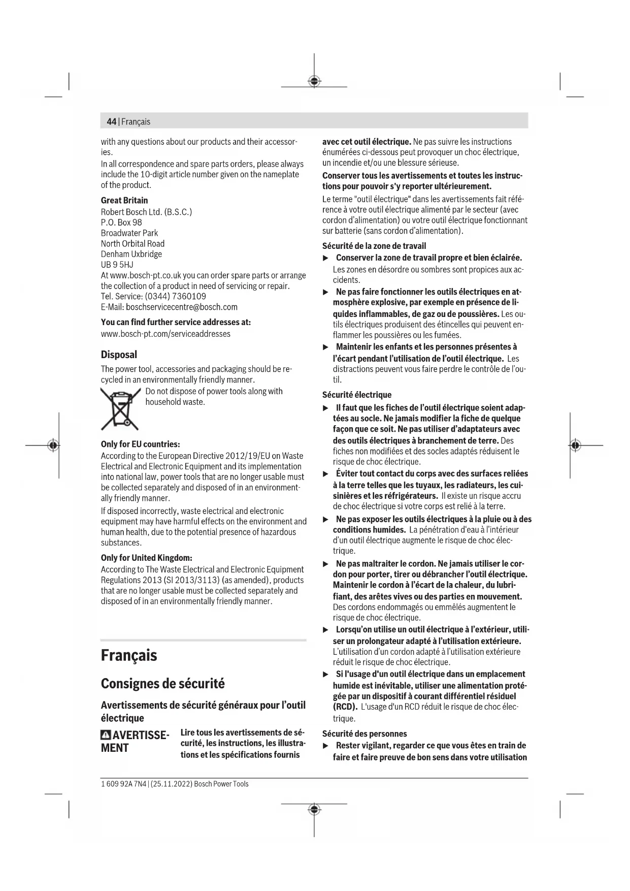 - / . Saw blades for wood and fibreboard, panels and strips 254 x 30 mm saw blade, 40 teeth 2608642530 Saw blades for hardwood, composites, plastic and non- ferrous metals 254 x 30 mm saw blade, 80 teeth 2608642528 After-Sales Service and Application Service Our after-sales service responds to your questions concern- ing maintenance and repair of your product as well as spare parts. You can find explosion drawings and information on spare parts at: www.bosch-pt.com The Bosch product use advice team will be happy to help you Bosch Power Tools 1 609 92A 7N4 | (25.11.2022)44 | Français with any questions about our products and their accessor- ies. In all correspondence and spare parts orders, please always include the 10‑digit article number given on the nameplate of the product. Great Britain Robert Bosch Ltd. (B.S.C.) P.O. Box 98 Broadwater Park North Orbital Road Denham Uxbridge UB 9 5HJ At www.bosch-pt.co.uk you can order spare parts or arrange the collection of a product in need of servicing or repair. Tel. Service: (0344) 7360109 E-Mail: boschservicecentre@bosch.com You can find further service addresses at: www.bosch-pt.com/serviceaddresses Disposal The power tool, accessories and packaging should be re- cycled in an environmentally friendly manner. Do not dispose of power tools along with household waste. Only for EU countries: According to the European Directive 2012/19/EU on Waste Electrical and Electronic Equipment and its implementation into national law, power tools that are no longer usable must be collected separately and disposed of in an environment- ally friendly manner. If disposed incorrectly, waste electrical and electronic equipment may have harmful effects on the environment and human health, due to the potential presence of hazardous substances. Only for United Kingdom: According to The Waste Electrical and Electronic Equipment Regulations 2013 (SI 2013/3113) (as amended), products that are no longer usable must be collected separately and disposed of in an environmentally friendly manner. Français Consignes de sécurité Avertissements de sécurité généraux pour l’outil électrique AVERTISSE- MENT Lire tous les avertissements de sé- curité, les instructions, les illustra- tions et les spécifications fournis avec cet outil électrique. Ne pas suivre les instructions énumérées ci-dessous peut provoquer un choc électrique, un incendie et/ou une blessure sérieuse. Conserver tous les avertissements et toutes les instruc- tions pour pouvoir s'y reporter ultérieurement. Le terme "outil électrique" dans les avertissements fait réfé- rence à votre outil électrique alimenté par le secteur (avec cordon d’alimentation) ou votre outil électrique fonctionnant sur batterie (sans cordon d’alimentation). Sécurité de la zone de travail u Conserver la zone de travail propre et bien éclairée. Les zones en désordre ou sombres sont propices aux ac- cidents. u Ne pas faire fonctionner les outils électriques en at- mosphère explosive, par exemple en présence de li- quides inflammables, de gaz ou de poussières. Les ou- tils électriques produisent des étincelles qui peuvent en- flammer les poussières ou les fumées. u Maintenir les enfants et les personnes présentes à l’écart pendant l’utilisation de l’outil électrique. Les distractions peuvent vous faire perdre le contrôle de l’ou- til. Sécurité électrique u Il faut que les fiches de l’outil électrique soient adap- tées au socle. Ne jamais modifier la fiche de quelque façon que ce soit. Ne pas utiliser d’adaptateurs avec des outils électriques à branchement de terre. Des fiches non modifiées et des socles adaptés réduisent le risque de choc électrique. u Éviter tout contact du corps avec des surfaces reliées à la terre telles que les tuyaux, les radiateurs, les cui- sinières et les réfrigérateurs. Il existe un risque accru de choc électrique si votre corps est relié à la terre. u Ne pas exposer les outils électriques à la pluie ou à des conditions humides. La pénétration d‘eau à l’intérieur d’un outil électrique augmente le risque de choc élec- trique. u Ne pas maltraiter le cordon. Ne jamais utiliser le cor- don pour porter, tirer ou débrancher l’outil électrique. Maintenir le cordon à l’écart de la chaleur, du lubri- fiant, des arêtes vives ou des parties en mouvement. Des cordons endommagés ou emmêlés augmentent le risque de choc électrique. u Lorsqu’on utilise un outil électrique à l’extérieur, utili- ser un prolongateur adapté à l’utilisation extérieure. L’utilisation d’un cordon adapté à l’utilisation extérieure réduit le risque de choc électrique. u Si l'usage d'un outil électrique dans un emplacement humide est inévitable, utiliser une alimentation proté- gée par un dispositif à courant différentiel résiduel (RCD). L'usage d'un RCD réduit le risque de choc élec- trique. Sécurité des personnes u Rester vigilant, regarder ce que vous êtes en train de faire et faire preuve de bon sens dans votre utilisation 1 609 92A 7N4 | (25.11.2022) Bosch Power ToolsFrançais | 45 de l’outil électrique. Ne pas utiliser un outil électrique lorsque vous êtes fatigué ou sous l’emprise de drogues, de l’alcool ou de médicaments. Un moment d’inattention en cours d’utilisation d’un outil électrique peut entraîner des blessures graves. u Utiliser un équipement de protection individuelle. Toujours porter une protection pour les yeux. Les équipements de protection individuelle tels que les masques contre les poussières, les chaussures de sécuri- té antidérapantes, les casques ou les protections audi- tives utilisés pour les conditions appropriées réduisent les blessures. u Éviter tout démarrage intempestif. S’assurer que l’in- terrupteur est en position arrêt avant de brancher l’outil au secteur et/ou au bloc de batteries, de le ra- masser ou de le porter. Porter les outils électriq