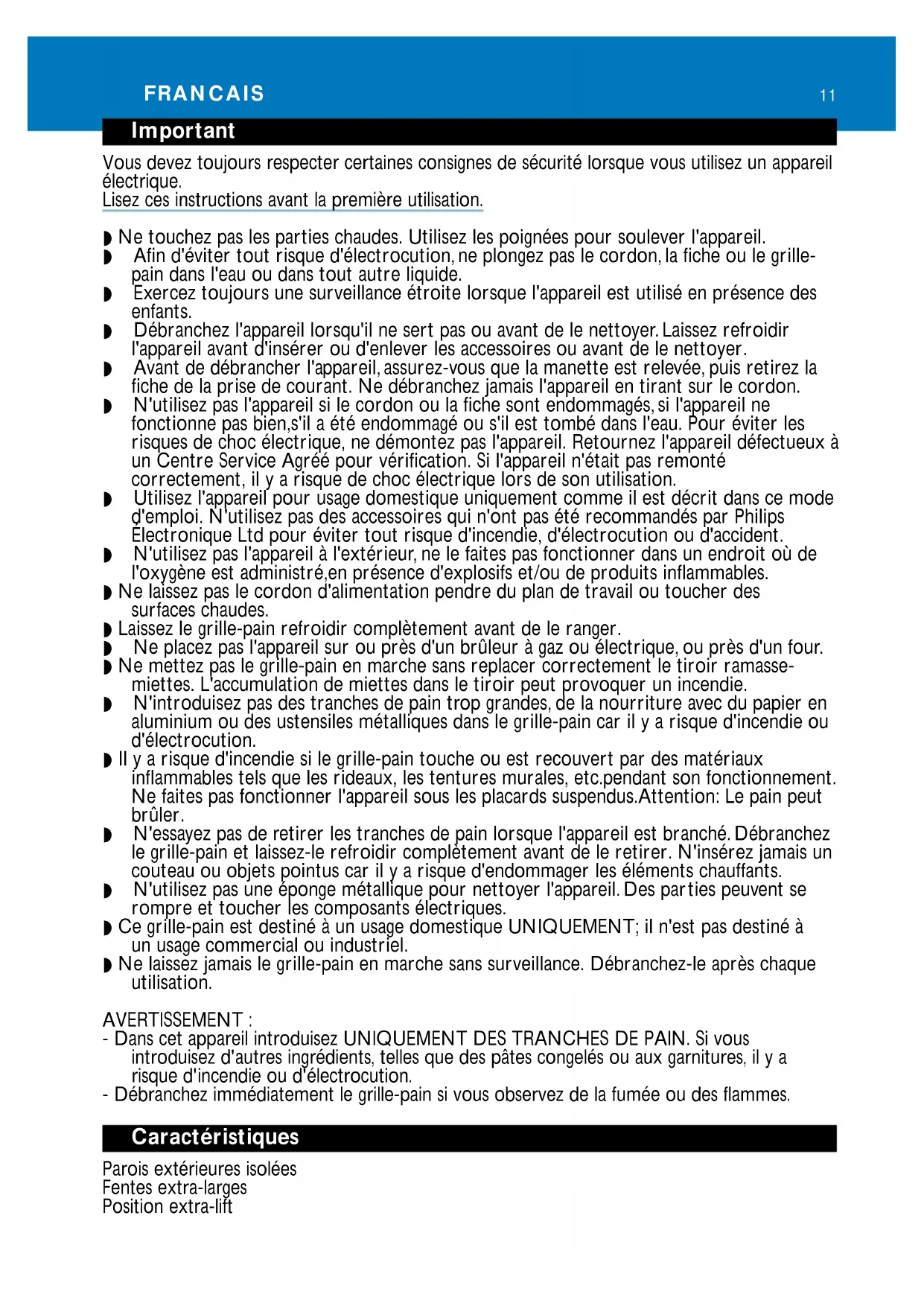 (Abb.1). Information und Service Weitere Informationen erhalten Sie im Internet unter www.philips.com.Wenden Sie sich mit Ihren Problemen, Fragen und Wünschen gegebenenfalls an das Philips Service Center in Ihrem Lande. Ist in Ihrem Land kein Philips Service Center vorhanden, so wenden Sie sich an das Service Department von Philips Domestic Appliances and Personal Care B.V. Die Telefonnummern entnehmen Sie bitte der beiliegenden Garantieschrift. DEUTSCH11 Important Vous devez toujours respecter certaines consignes de sécurité lorsque vous utilisez un appareil électrique. Lisez ces instructions avant la première utilisation. ◗ Ne touchez pas les parties chaudes. Utilisez les poignées pour soulever l'appareil. ◗ Afin d'éviter tout risque d'électrocution,ne plongez pas le cordon,la fiche ou le grille- pain dans l'eau ou dans tout autre liquide. ◗ Exercez toujours une surveillance étroite lorsque l'appareil est utilisé en présence des enfants. ◗ Débranchez l'appareil lorsqu'il ne sert pas ou avant de le nettoyer. Laissez refroidir l'appareil avant d'insérer ou d'enlever les accessoires ou avant de le nettoyer. ◗ Avant de débrancher l'appareil,assurez-vous que la manette est relevée, puis retirez la fiche de la prise de courant. Ne débranchez jamais l'appareil en tirant sur le cordon. ◗ N'utilisez pas l'appareil si le cordon ou la fiche sont endommagés,si l'appareil ne fonctionne pas bien,s'il a été endommagé ou s'il est tombé dans l'eau. Pour éviter les risques de choc électrique, ne démontez pas l'appareil. Retournez l'appareil défectueux à un Centre Service Agréé pour vérification. Si l'appareil n'était pas remonté correctement, il y a risque de choc électrique lors de son utilisation. ◗ Utilisez l'appareil pour usage domestique uniquement comme il est décrit dans ce mode d'emploi. N'utilisez pas des accessoires qui n'ont pas été recommandés par Philips Électronique Ltd pour éviter tout risque d'incendie, d'électrocution ou d'accident. ◗ N'utilisez pas l'appareil à l'extérieur, ne le faites pas fonctionner dans un endroit où de l'oxygène est administré,en présence d'explosifs et/ou de produits inflammables. ◗ Ne laissez pas le cordon d'alimentation pendre du plan de travail ou toucher des surfaces chaudes. ◗ Laissez le grille-pain refroidir complètement avant de le ranger. ◗ Ne placez pas l'appareil sur ou près d'un brûleur à gaz ou électrique, ou près d'un four. ◗ Ne mettez pas le grille-pain en marche sans replacer correctement le tiroir ramasse- miettes. L'accumulation de miettes dans le tiroir peut provoquer un incendie. ◗ N'introduisez pas des tranches de pain trop grandes, de la nourriture avec du papier en aluminium ou des ustensiles métalliques dans le grille-pain car il y a risque d'incendie ou d'électrocution. ◗ Il y a risque d'incendie si le grille-pain touche ou est recouvert par des matériaux inflammables tels que les rideaux, les tentures murales, etc.pendant son fonctionnement. Ne faites pas fonctionner l'appareil sous les placards suspendus.Attention: Le pain peut brûler. ◗ N'essayez pas de retirer les tranches de pain lorsque l'appareil est branché.Débranchez le grille-pain et laissez-le refroidir complètement avant de le retirer. N'insérez jamais un couteau ou objets pointus car il y a risque d'endommager les éléments chauffants. ◗ N'utilisez pas une éponge métallique pour nettoyer l'appareil. Des parties peuvent se rompre et toucher les composants électriques. ◗ Ce grille-pain est destiné à un usage domestique UNIQUEMENT; il n'est pas destiné à un usage commercial ou industriel. ◗ Ne laissez jamais le grille-pain en marche sans surveillance. Débranchez-le après chaque utilisation.