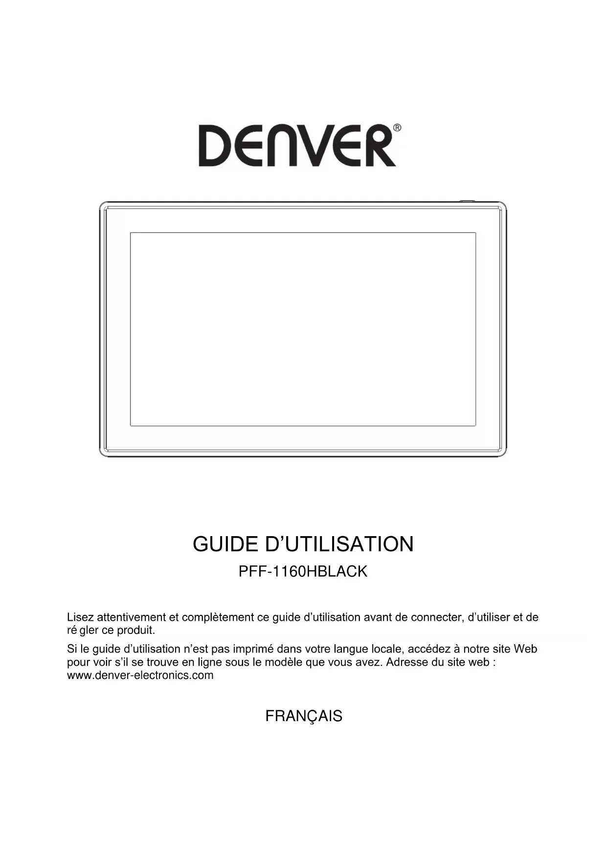 PFF-1160HBLACK Lisez attentivement et complètement ce guide d’utilisation avant de connecter, d’utiliser et de régler ce produit. Si le guide d’utilisation n’est pas imprimé dans votre langue locale, accédez à notre site Web pour voir s’il se trouve en ligne sous le modèle que vous avez. Adresse du site web : www.denver-electronics.com FRANÇAISFRA-1