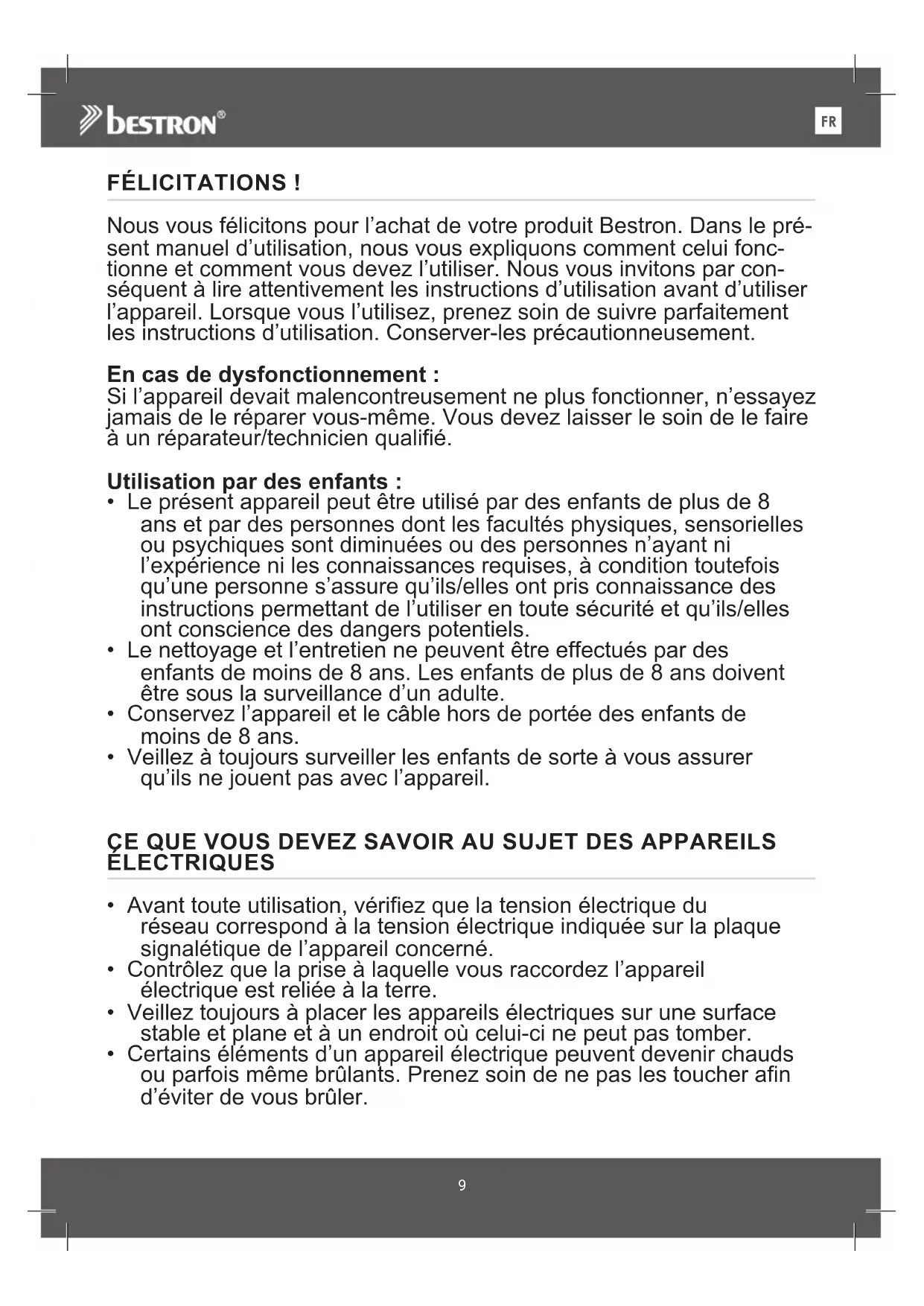 FÉLICITATIONS ! Nous vous félicitons pour l’achat de votre produit Bestron. Dans le pré- sent manuel d’utilisation, nous vous expliquons comment celui fonc- tionne et comment vous devez l’utiliser. Nous vous invitons par con- séquent à lire attentivement les instructions d’utilisation avant d’utiliser l’appareil. Lorsque vous l’utilisez, prenez soin de suivre parfaitement les instructions d’utilisation. Conserver-les précautionneusement. En cas de dysfonctionnement : Si l’appareil devait malencontreusement ne plus fonctionner, n’essayez jamais de le réparer vous-même. Vous devez laisser le soin de le faire à un réparateur/technicien qualifié. Utilisation par des enfants :