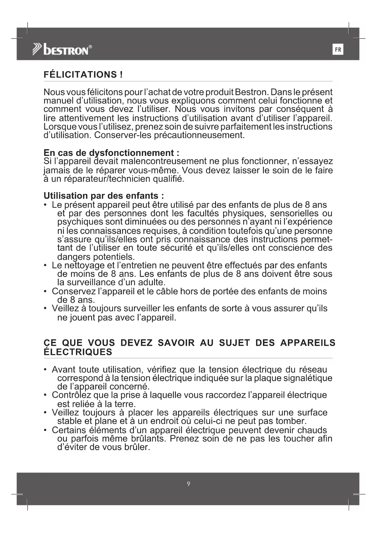 FÉLICITATIONS ! Nous vous félicitons pour l’achat de votre produit Bestron. Dans le présent manuel d’utilisation, nous vous expliquons comment celui fonctionne et comment vous devez l’utiliser. Nous vous invitons par conséquent à lire attentivement les instructions d’utilisation avant d’utiliser l’appareil. Lorsque vous l’utilisez, prenez soin de suivre parfaitement les instructions d’utilisation. Conserver-les précautionneusement. En cas de dysfonctionnement : Si l’appareil devait malencontreusement ne plus fonctionner, n’essayez jamais de le réparer vous-même. Vous devez laisser le soin de le faire à un réparateur/technicien qualifié. Utilisation par des enfants :