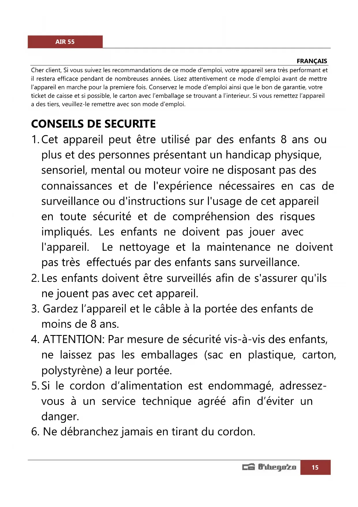 6. Ne débranchez jamais en tirant du cordon.AIR 55