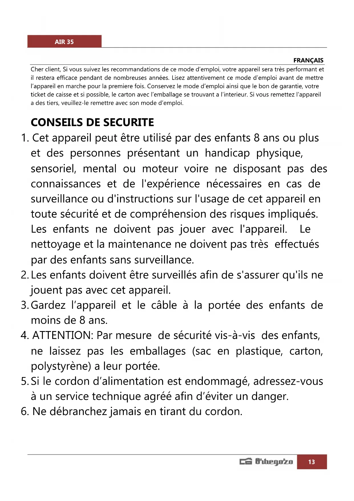 6. Ne débranchez jamais en tirant du cordon.AIR 35