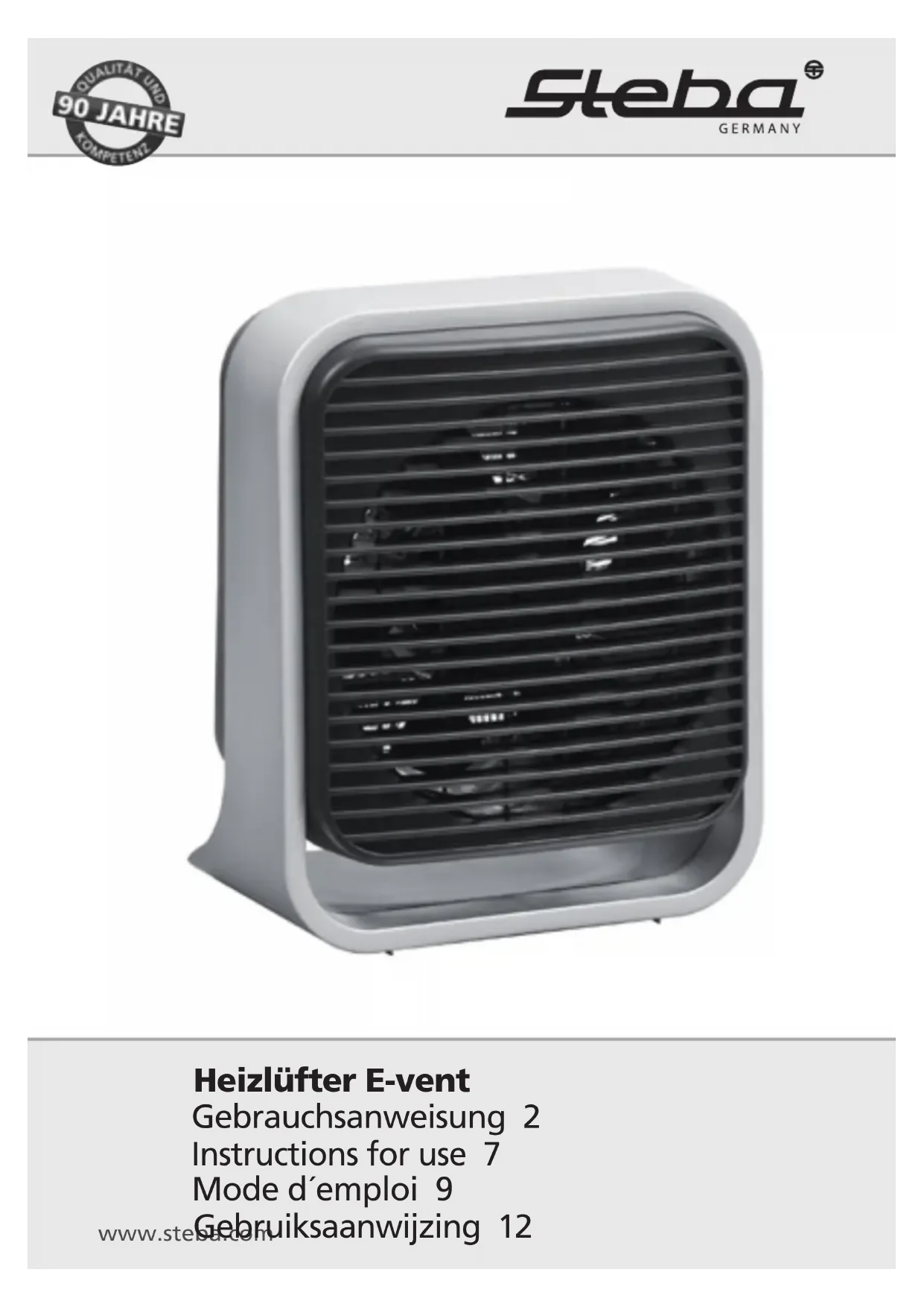 en ne le plaçant jamais juste au-dessous d’une prise de courant. ∙ Ne laissez jamais les enfants et les animaux jouer ou toucher l’appareil. Attention ! ∙ Pendant le fonctionnement, la grille de sortie de l’air peut atteindre une tempéra- ture très élevée (plus de 90°C) ; ∙ IMPORTANT : pour éviter tout risque de surchauffe ne couvrez jamais l’appareil. Ne posez jamais ni objet, ni couverture, sur l’appareil lorsqu’il est en marche. Cette interdiction est écrite clairement sur l’appareil et illustrée par ce symbole. N’utilisez pas l’appareil dans des pièces saturées de gaz explosifs, de vapeurs géné- ∙ rées par des solvants ou des vernis ou de vapeurs/gaz inflammables. Si le câble d’alimentation est endommagé, il doit être remplacé par le fabricant, son ∙ service après vente ou une personne de qualification similaire afin d’éviter un danger Placez l’appareil de façon à ce que la prise d’alimentation soit toujours accessible. ∙ Le radiateur soufflant est fabriqué en double isolement électrique (classe II) et ainsi ∙ ne requiert pas la connexion de terre. N’enroulez pas le câble autour de l’appareil et ne le laissez pas en contact avec un ∙ matériau tranchant; n’allumez pas l’appareil quand le câble est enroulé Pour débrancher l’appareil, ne tirez ni sur le câble d’alimentation, ni sur l’appareil ∙ Utilisez l’appareil seulement en position verticale; ∙ En utilisation mobile, maintenez toujours une distance d’au moins 1 mètre entre ∙ l’appareil et tout objet inflammable. L’installation doit être effectuée conformément aux règles de l’art et en conformi- ∙ té avec la norme en vigueur dans votre pays. Utilisation Le soufflant est muni de deux boutons : un pour l’interrupteur et un pour le ther- ∙ mostat. L’interrupteur, qui a 4 positions, permet de régler le fonctionnement de l’appareil; ∙ positionnez le bouton dans le mode de fonctionnement que vous désirez : OFF (arrêt) - VENTILATION FROIDE – 1000W – 2000W ∙ Emploi du thermostat Dans un local ou la température dépasse les 30°C il est normal que le thermostat, ∙ même si placé à son maximum, n’active pas l’appareil. Par contre, dans un local où la température est très basse (au-dessous des 5°C), il ∙ est normal que le thermostat maintienne l’appareil constamment allumé, même lorsque celui-ci est réglé au minimum. Pour régler au mieux le thermostat, nous conseillons la procédure suivante : ∙ placer le thermostat au maximum et faire fonctionner l’appareil jusqu’à atteindre ∙ une température de tout confort; tourner ensuite le bouton du thermostat dans le sens contraire aux aiguilles d’une ∙ montre jusqu’à entendre un “click” et l’appareil s’éteindra; ensuite, tourner encore légèrement (seulement un petit peu) le bouton du thermo- ∙ stat dans le sens des aiguilles d’une montre; lorsque dans cette position, le thermostat conservera la température ambiante que ∙ vous avez choisie. Sécurité en cas de fonctionnement anormal Dans le cas d’échauffement anormal de l’appareil, le système de protection contre ∙ la surchauffe interviendra. Si ça arrive : Arrêtez le fonctionnement de l’appareil en positionnant l’interrupteur en position 0 ∙ Eliminez les causes de surchauffe : obstacle devant ou derrière l’appareil qui ∙ empêchent le correcte débit d’air, accumulation de poussière, position de l’appareil trop proche à des surfaces derrière la prise d’aire ou devant la sortie. Laissez l’appareil refroidir pendant 15 minutes ∙ Remettez l’appareil en marche et vérifiez s’il fonctionne correctement. ∙ Si vous notez après ça un fonctionnement encore irrégulier de l’appareil ou des ∙ dommages à la structure ou au corps de l’appareil, déconnectez l’appareil et appe- lez un service après vente qualifié ou votre revendeur pour assistance. Entretien Cet appareil n’a besoin d’aucun entretien particulier. ∙ Nous vous recommandons de nettoyer l’appareil tous les 6 mois, à l’aide d’un chif- ∙ fon sec. Si l’appareil doit être réparé, adressez-vous à un service après-vente. ∙ Si vous devez remplacer le câble d’alimentation n’oubliez que vous devez obliga- ∙ toirement utiliser un câble de, 2x0.75m2 H05VV-F <HAR>. Si le câble d’alimentation est endommagé, il doit être changé par le fabricant, son service de maintenance ou une personne de qualification similaire afin d’éviter un danger. Evacuation correcte de ce produit: Rendre les appareils ayant fait leur temps immédiatement inutilisables Au sein de l’EU, ce symbole indique que ce produit ne doit pas être évacué avec les déchets mécaniques. Les vieux appareils contiennent des matériaux qui peuvent être recyclés et qui devraient être déposés à des centres de ré- cupération et afin de ne pas altérer l’environnement, voire la santé des personnes par une élimintation des déchets non-contrôlée. Veuillez donc évacuer les appareils usés par des systèmes de collecte bien appropriés ou envoyez-lea opoù vous l’avez acheté en vue d’évacuation. L’appareil sera alors amené à la récupération des matériaux. Service Après-Vente: Si contre toute attente, votre appareil devait avoir besoin du SAV, veuillez alors vous adresser à l’adresse suivante. Nous en organiserons alors d’enlèvement. Des paquets non affranchis ne pourront pas être pris en charge. STEBA Elektrogeräte GmbH & Co KG Pointstr. 2, 96129 Strullendorf / Germany Distribution-Tél.: 09543 / 449-17 / -18, Service-Tél.: 09543 / 449-44, Fax: 09543 / 449-19 e-Mail: elektro@steba.com Internet: http://www.steba.com Attention! Les appareils électriques ne seront réparés que par du personnel élec- tricien qualifié étant donné que des réparations non-conformes peuvent avoir des conséquences graves.12