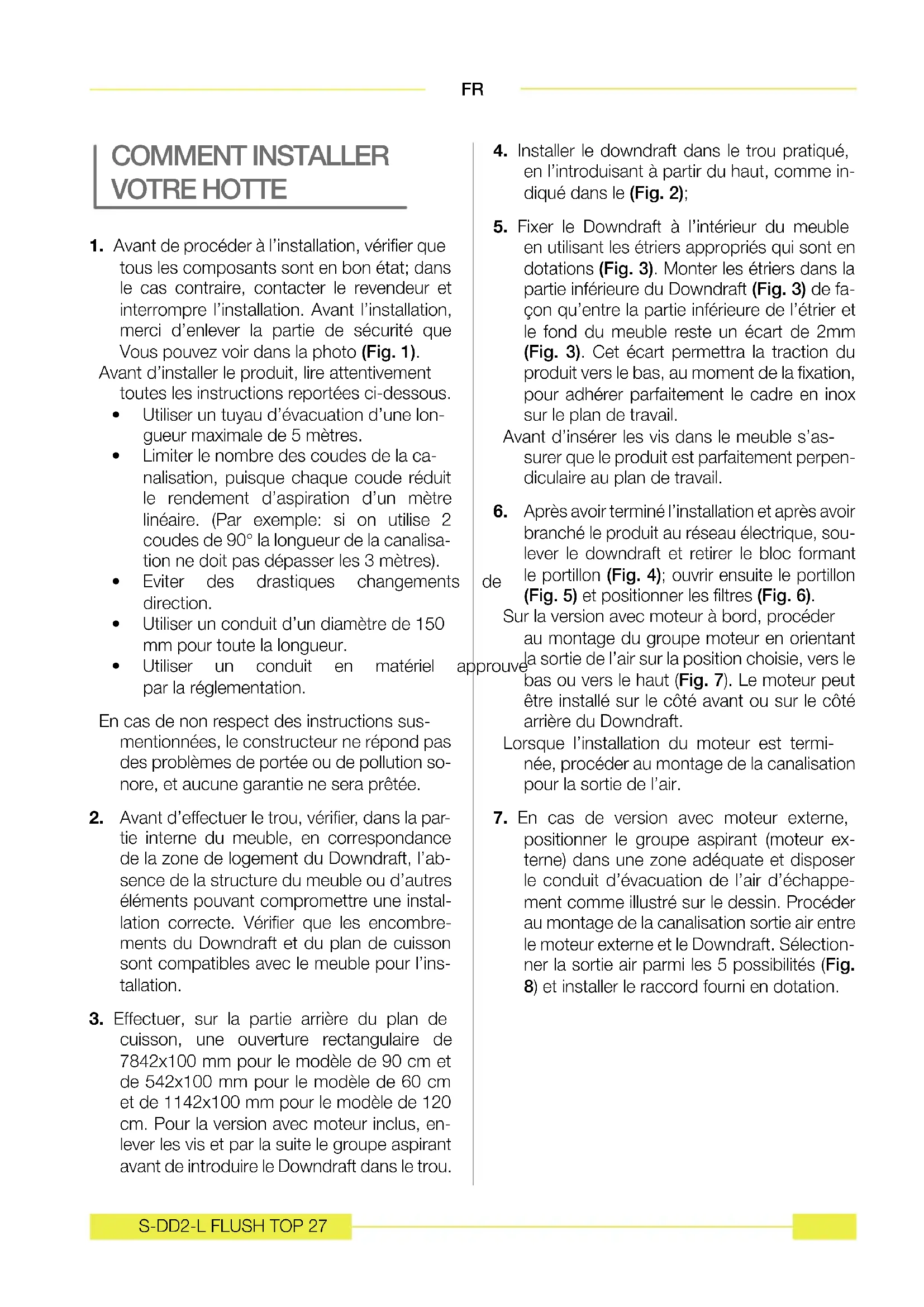 - Pendant la manipulation du Downdraft, ne pas positionner les mains dans le rayon d’ac- tion du chariot amovible. Dans le souci d’une amélioration constante de nos produits, nous nous réservons le droit d’apporter à leurs caractéristiques techniques, fonctionnelles ou esthétiques toutes modifica- tions de leurs caractéristiques liées à l’évolution technique. Pour la version Esternal Motor, pour un fonctionnement correct du Downdraft, il est nécessaire d’utiliser un groupe aspirant (moteur externe) fourni par le même producteur. L’air recueilli ne doit pas être convoyé dans un conduit utilisé pour l’évacuation des fumées d’appareils alimentés avec une énergie différente de celle électrique (installations de chauffage centralisées, etc.). Pour décharger l’air à éva- cuer, suivre les prescriptions des autorités com- pétentes. AVERTISSEMENT Conservez cette notice d’utilisation avec votre appareil. Si l’appareil devait être ven- du ou cédé à une autre personne, assurez- vous que la présente notice accompagne l’appareil. Merci de prendre connaissance de ces conseils avant d’installer et d’utiliser l’appareil. Ils ont été rédigés pour votre sé- curité et celle d’autrui.S-DD2-L FLUSH TOP 25