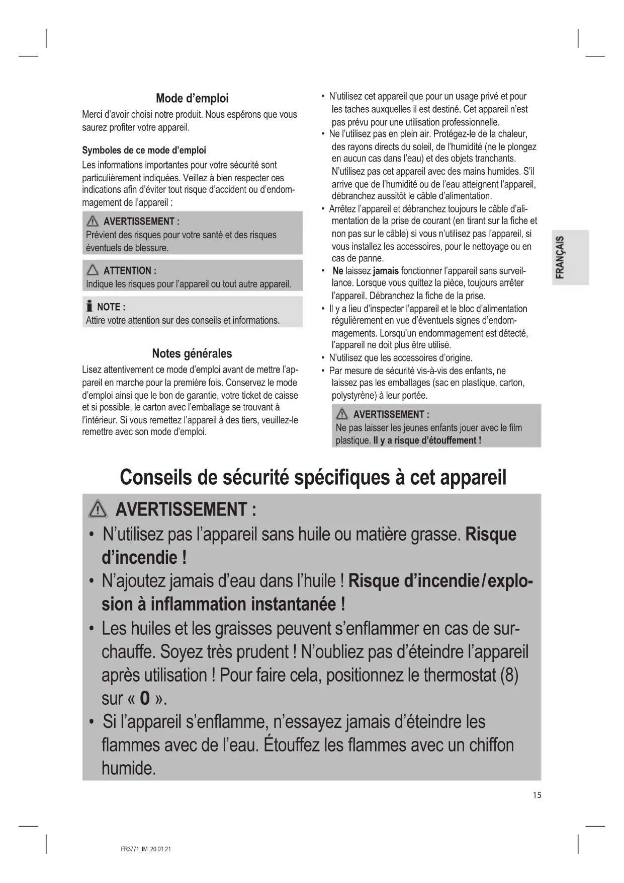 - Si l’appareil s’enamme, n’essayez jamais d’éteindre les ammes avec de l’eau. Étouffez les ammes avec un chiffon humide.FR3771_IM 20.01.21