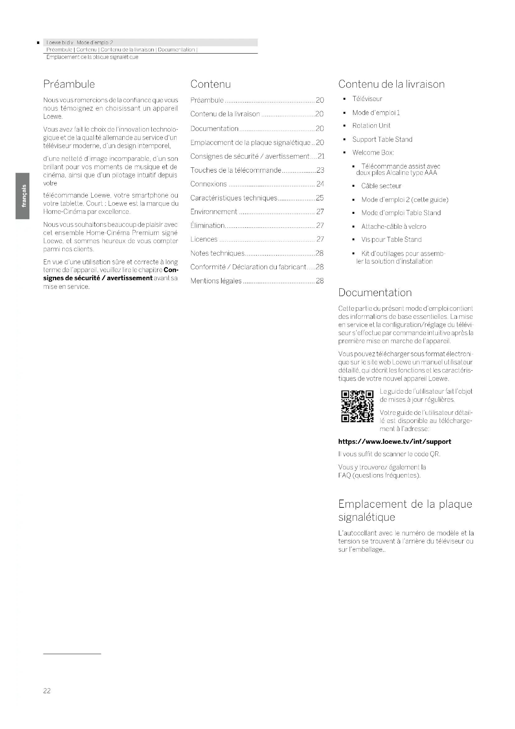 - Loewe bild v | Mode d’emploi 2 deutsch français Préambule | Contenu | Contenu de la livraison | Documentation | Emplacement de la plaque signalétique Préambule Nous vous remercions de la confiance que vous nous témoignez en choisissant un appareil Loewe. Vous avez fait le choix de l’innovation technolo- gique et de la qualité allemande au service d‘un téléviseur moderne, d’un design intemporel, d’une netteté d‘image incomparable, d’un son brillant pour vos moments de musique et de cinéma, ainsi que d’un pilotage intuitif depuis votre télécommande Loewe, votre smartphone ou votre tablette. Court : Loewe est la marque du Home-Cinéma par excellence. Nous vous souhaitons beaucoup de plaisir avec cet ensemble Home-Cinéma Premium signé Loewe, et sommes heureux de vous compter parmi nos clients. En vue d’une utilisation sûre et correcte à long terme de l’appareil, veuillez lire le chapitre Con- signes de sécurité / avertissement avant sa mise en service. Contenu Préambule p. 20