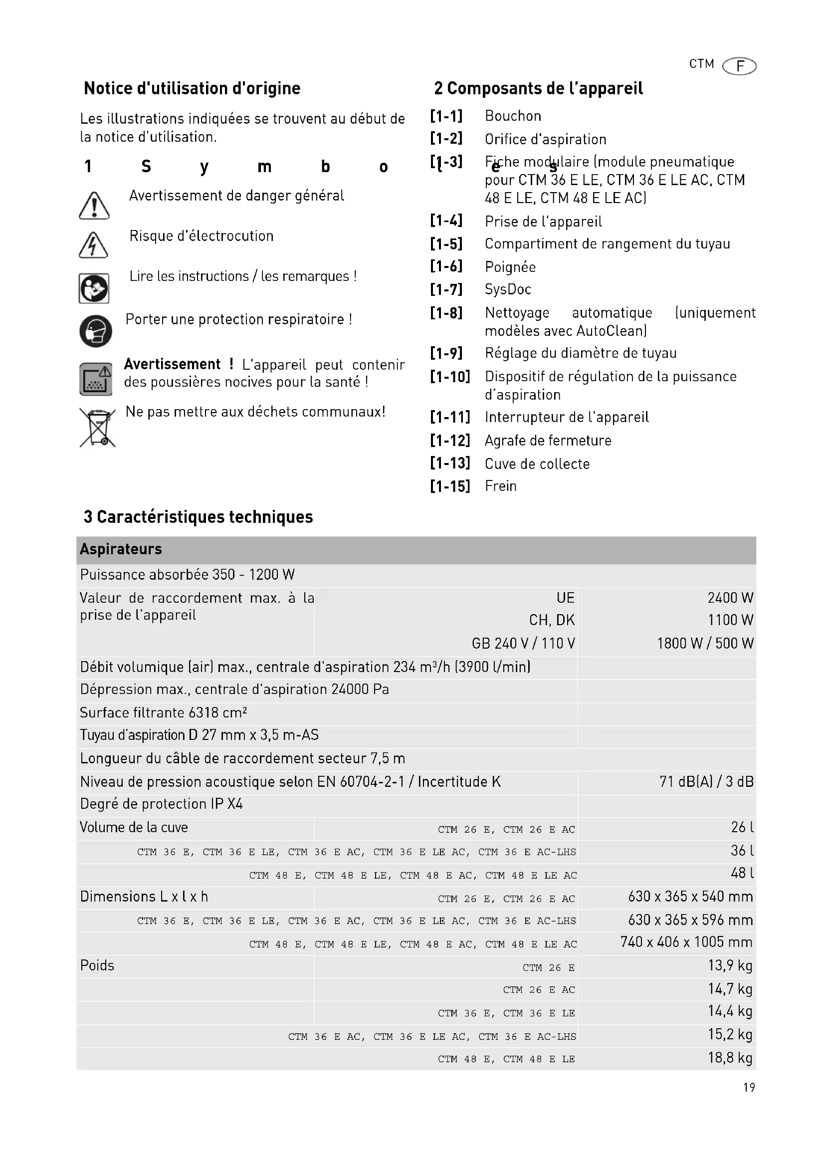 Notice d'utilisation d'origine Les illustrations indiquées se trouvent au début de la notice d'utilisation. 1Symboles 2 Composants de l’appareil 3 Caractéristiques techniques Avertissement de danger général Risque d'électrocution Lire les instructions / les remarques ! Porter une protection respiratoire ! Avertissement ! L'appareil peut contenir des poussières nocives pour la santé ! Ne pas mettre aux déchets communaux! [1-1] Bouchon [1-2] Orifice d'aspiration [1-3] Fiche modulaire (module pneumatique pour CTM 36 E LE, CTM 36 E LE AC, CTM 48 E LE, CTM 48 E LE AC) [1-4] Prise de l'appareil [1-5] Compartiment de rangement du tuyau [1-6] Poignée [1-7] SysDoc [1-8] Nettoyage automatique (uniquement modèles avec AutoClean) [1-9] Réglage du diamètre de tuyau [1-10] Dispositif de régulation de la puissance d’aspiration [1-11] Interrupteur de l'appareil [1-12] Agrafe de fermeture [1-13] Cuve de collecte [1-15] Frein Aspirateurs Puissance absorbée 350 - 1200 W Valeur de raccordement max. à la prise de l'appareil