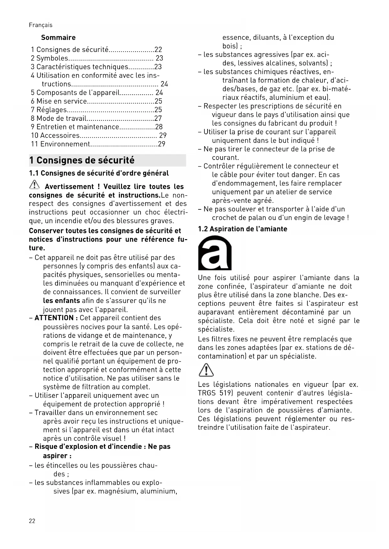 Avertissement ! Veuillez lire toutes les consignes de sécurité et instructions.Le non- respect des consignes d'avertissement et des instructions peut occasionner un choc électri que, un incendie et/ou des blessures graves. Conserver toutes les consignes de sécurité et notices d'instructions pour une référence fu ture. – Cet appareil ne doit pas être utilisé par des personnes (y compris des enfants) aux ca pacités physiques, sensorielles ou menta les diminuées ou manquant d'expérience et de connaissances. Il convient de surveiller les enfants afin de s'assurer qu'ils ne jouent pas avec l'appareil. – ATTENTION : Cet appareil contient des poussières nocives pour la santé. Les opé rations de vidange et de maintenance, y compris le retrait de la cuve de collecte, ne doivent être effectuées que par un person nel qualifié portant un équipement de pro tection approprié et conformément à cette notice d'utilisation. Ne pas utiliser sans le système de filtration au complet. – Utiliser l'appareil uniquement avec un équipement de protection approprié ! – Travailler dans un environnement sec après avoir reçu les instructions et unique ment si l'appareil est dans un état intact après un contrôle visuel ! – Risque d'explosion et d'incendie : Ne pas aspirer : – les étincelles ou les poussières chau des ; – les substances inflammables ou explo sives (par ex. magnésium, aluminium, essence, diluants, à l'exception du bois) ; – les substances agressives (par ex. aci des, lessives alcalines, solvants) ; – les substances chimiques réactives, en traînant la formation de chaleur, d'aci des/bases, de gaz etc. (par ex. bi-maté riaux réactifs, aluminium et eau). – Respecter les prescriptions de sécurité en vigueur dans le pays d'utilisation ainsi que les consignes du fabricant du produit ! – Utiliser la prise de courant sur l'appareil uniquement dans le but indiqué ! – Ne pas tirer le connecteur de la prise de courant. – Contrôler régulièrement le connecteur et le câble pour éviter tout danger. En cas d'endommagement, les faire remplacer uniquement par un atelier de service après-vente agréé. – Ne pas soulever et transporter à l'aide d'un crochet de palan ou d'un engin de levage !