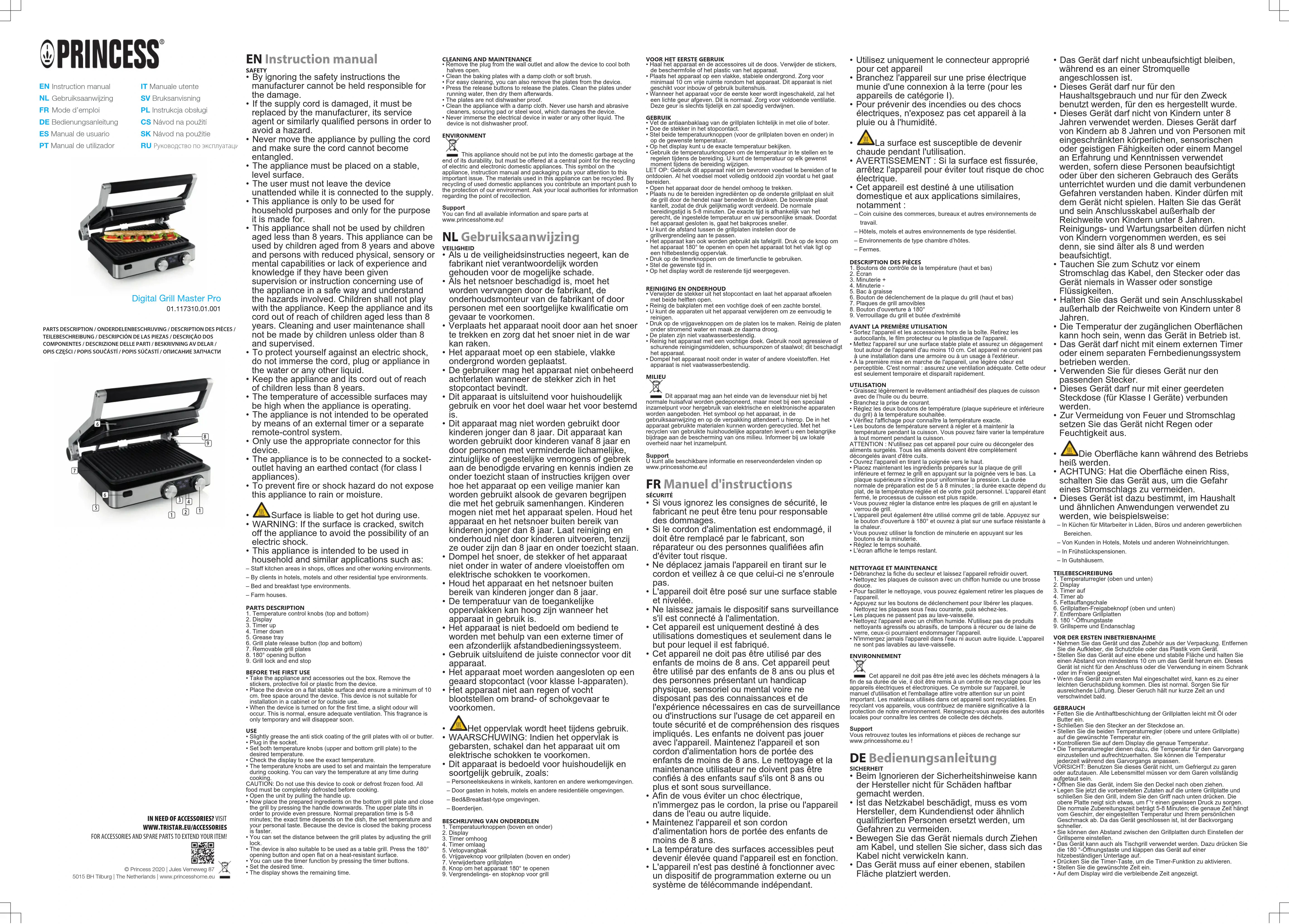 - Cet appareil est destiné à une utilisation domestique et aux applications similaires, notamment: – Coin cuisine des commerces, bureaux et autres environnements detravail.– Hôtels, motels et autres environnements de type résidentiel.– Environnements de type chambre d’hôtes.– Fermes.DESCRIPTION DES PIÈCES1. Boutons de contrôle de la température (haut et bas)2. Écran3. Minuterie+4. Minuterie-5. Bac à graisse6. Bouton de déclenchement de la plaque du grill (haut et bas)7. Plaques de grill amovibles8. Bouton d'ouverture à 180°9. Verrouillage du grill et butée d'extrémitéAVANT LA PREMIÈRE UTILISATION• Sortez l'appareil et les accessoires hors de la boîte.Retirez lesautocollants, le film protecteur ou le plastique de l'appareil.• Mettez l'appareil sur une surface stable plate et assurez un dégagementtout autour de l'appareil d'au moins 10 cm. Cet appareil ne convient pasà une installation dans une armoire ou à un usage à l'extérieur.• À la première mise en marche de l'appareil, une légère odeur estperceptible. C'est normal : assurez une ventilation adéquate. Cette odeurest seulement temporaire et disparaît rapidement.UTILISATION• Graissez légèrement le revêtement antiadhésif des plaques de cuissonavec de l’huile ou du beurre.• Branchez la prise de courant.• Réglez les deux boutons de température (plaque supérieure et inférieuredu gril) à la température souhaitée.• Vérifiez l'affichage pour connaître la température exacte.• Les boutons de température servent à régler et à maintenir latempérature pendant la cuisson. Vous pouvez faire varier la températureà tout moment pendant la cuisson.ATTENTION: N'utilisez pas cet appareil pour cuire ou décongeler desaliments surgelés. Tous les aliments doivent être complètementdécongelés avant d'être cuits.• Ouvrez l'appareil en tirant la poignée vers le haut.• Placez maintenant les ingrédients préparés sur la plaque de grillinférieure et fermez le grill en appuyant sur la poignée vers le bas. Laplaque supérieure s’incline pour uniformiser la pression. La duréenormale de préparation est de 5 à 8minutes; la durée exacte dépend duplat, de la température réglée et de votre goût personnel. L'appareil étantfermé, le processus de cuisson est plus rapide.• Vous pouvez régler la distance entre les plaques de grill en ajustant leverrou de grill.• L'appareil peut également être utilisé comme gril de table. Appuyez surle bouton d'ouverture à 180° et ouvrez à plat sur une surface résistante àla chaleur.• Vous pouvez utiliser la fonction de minuterie en appuyant sur lesboutons de la minuterie.• Réglez le temps souhaité.• L'écran affiche le temps restant.NETTOYAGE ET MAINTENANCE• Débranchez la fiche du secteur et laissez l’appareil refroidir ouvert.• Nettoyez les plaques de cuisson avec un chiffon humide ou une brossedouce.• Pour faciliter le nettoyage, vous pouvez également retirer les plaques del'appareil.• Appuyez sur les boutons de déclenchement pour libérer les plaques.Nettoyez les plaques sous l'eau courante, puis séchez-les.• Les plaques ne passent pas au lave-vaisselle.• Nettoyez l'appareil avec un chiffon humide. N'utilisez pas de produitsnettoyants agressifs ou abrasifs, de tampons à récurer ou de laine deverre, ceux-ci pourraient endommager l'appareil.• N'immergez jamais l'appareil dans l'eau ni aucun autre liquide. L'appareilne sont pas lavables au lave-vaisselle.ENVIRONNEMENTCet appareil ne doit pas être jeté avec les déchets ménagers à lafin de sa durée de vie, il doit être remis à un centre de recyclage pour lesappareils électriques et électroniques. Ce symbole sur l'appareil, lemanuel d'utilisation et l'emballage attire votre attention sur un pointimportant. Les matériaux utilisés dans cet appareil sont recyclables. Enrecyclant vos appareils, vous contribuez de manière significative à laprotection de notre environnement. Renseignez-vous auprès des autoritéslocales pour connaître les centres de collecte des déchets.SupportVous retrouvez toutes les informations et pièces de rechange surwww.princesshome.eu! DEBedienungsanleitung SICHERHEIT