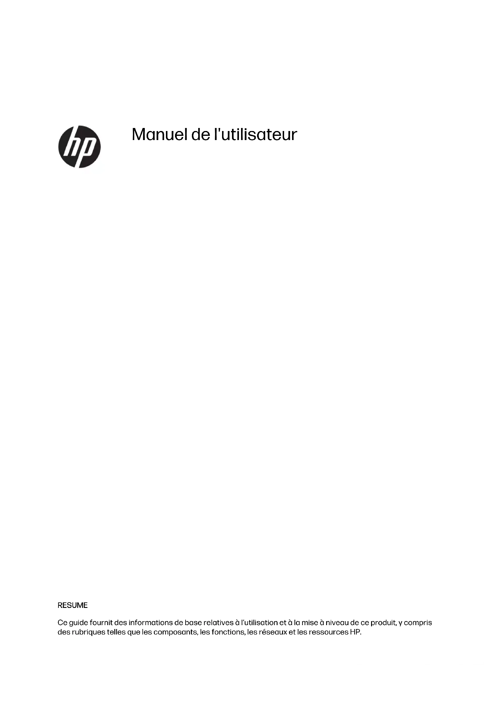 - Manuel de l'utilisateur RESUME Ce guide fournit des informations de base relatives à l’utilisation et à la mise à niveau de ce produit, y compris des rubriques telles que les composants, les fonctions, les réseaux et les ressources HP.Informations légales © Copyright 2023 HP Development Company, L.P. Bluetooth est une marque commerciale détenue par son propriétaire et utilisée sous licence par HP Inc. Les termes HDMI, HDMI High-Definition Multimedia Interface et le logo HDMI sont des marques commerciales ou des marques commerciales déposées de HDMI Licensing Administrator, Inc. Intel, Celeron, Pentium et Thunderbolt sont des marques commerciales d'Intel Corporation ou de ses filiales aux États-Unis et/ou dans d'autres pays. Microsoft et Windows sont des marques commerciales déposées ou des marques commerciales de Microsoft Corporation aux États-Unis et/ou dans d'autres pays. NVIDIA et le logo NVIDIA sont des marques commerciales et/ou des marques commerciale déposées de NVIDIA Corporation aux États-Unis et dans d'autres pays. USB Type-C® et USB-C® sont des marques commerciales déposées d'USB Implementers Forum. DisplayPort™ et le logo DisplayPort™ sont des marques commerciales et sont la propriété de Video Electronics Standards Association (VESA) aux États-Unis et dans d'autres pays. Miracast® est une marque commerciale déposée de Wi-Fi Alliance. Les informations contenues dans ce document peuvent être modifiées sans préavis. Les garanties relatives aux produits et aux services HP sont décrites dans les textes de garantie limitée expresse qui les accompagnent. Aucun élément du présent document ne peut être interprété comme constituant une garantie supplémentaire. HP ne saurait être tenu pour responsable des erreurs ou omissions de nature technique ou rédactionnelle qui pourraient subsister dans le présent document. Première édition : mars 2023 Numéro de référence du document : N34991-051 Informations sur le produit Ce manuel décrit les fonctions communes à la plupart des produits. Certaines fonctions peuvent ne pas être disponibles sur votre ordinateur. Toutes les éditions ou versions de Windows ne proposent pas l'intégralité de ces fonctionnalités. Les systèmes peuvent nécessiter la mise à niveau et/ou l'achat distinct de matériel, pilotes, logiciels, ou la mise à jour du BIOS pour profiter pleinement des fonctionnalités de Windows. Windows est mis à jour automatiquement et est toujours activé. Internet haut débit et compte Microsoft requis. Des frais d'accès à internet sont susceptibles de s'appliquer et au fil du temps, des exigences supplémentaires peuvent s'appliquer aux mises à jour. Reportez-vous au site http://www.windows.com. Si votre produit est livré avec Windows en mode S : Windows en mode S fonctionne exclusivement avec les applications du Microsoft Store dans Windows. Dans certains cas, les paramétrages, caractéristiques et applications par défaut ne peuvent pas être modifiés. Certains accessoires et certaines applications compatibles avec Windows peuvent ne pas fonctionner (y compris certains antivirus, créateurs PDF, utilitaires de pilotes et applications d'accessibilité), et les performances peuvent varier, même si vous quittez le mode S. Si vous passez en mode Windows, vous ne pouvez pas revenir en mode S. Pour en savoir plus, consultez Windows.com/SmodeFAQ. Pour avoir accès à la dernière version des manuels de l'utilisateur, rendez-vous sur le site http://www.hp.com/support, puis suivez les instructions pour rechercher votre produit. Puis, sélectionnez Manuels. Conditions d'utilisation des logiciels En installant, copiant, téléchargeant ou utilisant tout logiciel préinstallé sur cet ordinateur, vous reconnaissez être lié par les termes du contrat de licence utilisateur final (CLUF) de HP. Si vous êtes en désaccord avec les termes de ce contrat, votre seul recours consiste à retourner le produit non utilisé dans sa totalité (matériel et logiciels) sous 14 jours pour un remboursement intégral conformément à la politique en matière de remboursement de votre vendeur. Pour obtenir plus d'informations ou pour demander un remboursement intégral du prix de l'ordinateur, prenez contact avec votre vendeur.Notice d'avertissement relative à la sécurité Éviter tout risque de blessure liée à la chaleur ou de surchauffe de l'ordinateur en suivant les conseils indiqués. AVERTISSEMENT ! Pour éviter tout risque de blessure associée à la chaleur ou de surchauffe de l'ordinateur, ne placez pas ce dernier sur vos genoux et n'obstruez pas ses ouvertures d'aération. Utilisez toujours l'ordinateur sur une surface plane et rigide. La ventilation ne doit pas être entravée par des éléments rigides, tels qu'une imprimante, ni par des éléments souples, tels que des coussins, du tissu ou un tapis épais. Par ailleurs, ne mettez pas en contact l'adaptateur secteur avec la peau ou des éléments souples, tels que des coussins, du tissu ou un tapis, pendant le fonctionnement de l'appareil. L'ordinateur et l'adaptateur secteur sont conformes aux limites de température de surface accessibles à l'utilisateur, définies par les normes de sécurité applicables. iiiParamètre de configuration du processeur (certains produits) Informations importantes sur les configurations de processeurs. IMPORTANT : Certains produits sont configurés avec un processeur Intel® Pentium® de séries N35xx/ N37xx ou Celeron® de séries N28xx/N29xx/N30xx/N31xx et un système d'exploitation Windows®. Sur ces modèles, ne modifiez pas le paramètre de configuration du processeur dans msconfig.exe en passant de 4 ou 2 processeurs à 1 processeur. En effet, cette modification empêchera votre ordinateur de redémarrer. Vous devrez alors effectuer une réinitialisation des données d'usine pour rétablir les paramètres d'origine. iv Paramètre de configuration du processeur (certains produits)À propos de