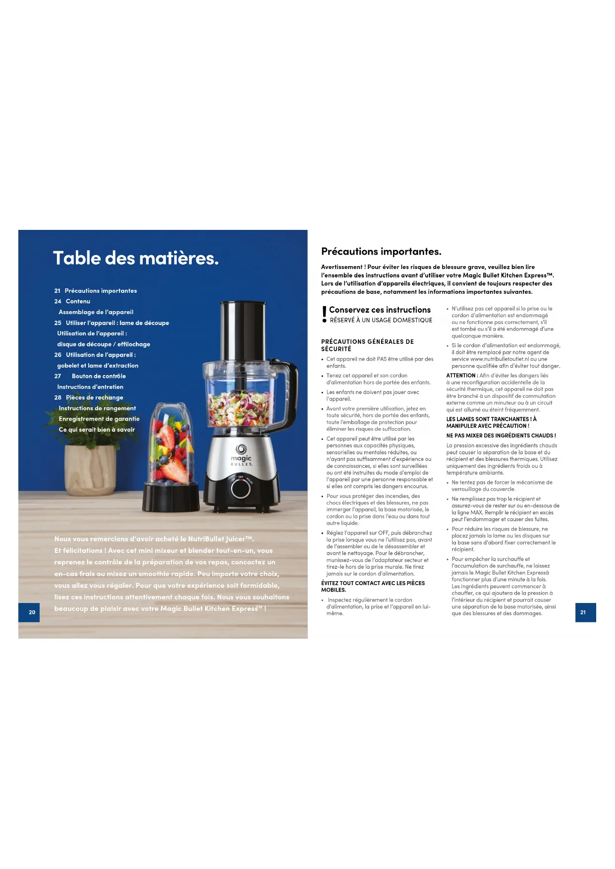 Instructions d’entretien 28 Pièces de rechange Instructions de rangement Enregistrement de garantie Ce qui serait bien à savoir Nous vous remercions d’avoir acheté le NutriBullet Juicer™. Et félicitations ! Avec cet mini mixeur et blender tout-en-un, vous reprenez le contrôle de la préparation de vos repas, concoctez un en-cas frais ou mixez un smoothie rapide. Peu importe votre choix, vous allez vous régaler. Pour que votre expérience soit formidable, lisez ces instructions attentivement chaque fois. Nous vous souhaitons beaucoup de plaisir avec votre Magic Bullet Kitchen Express