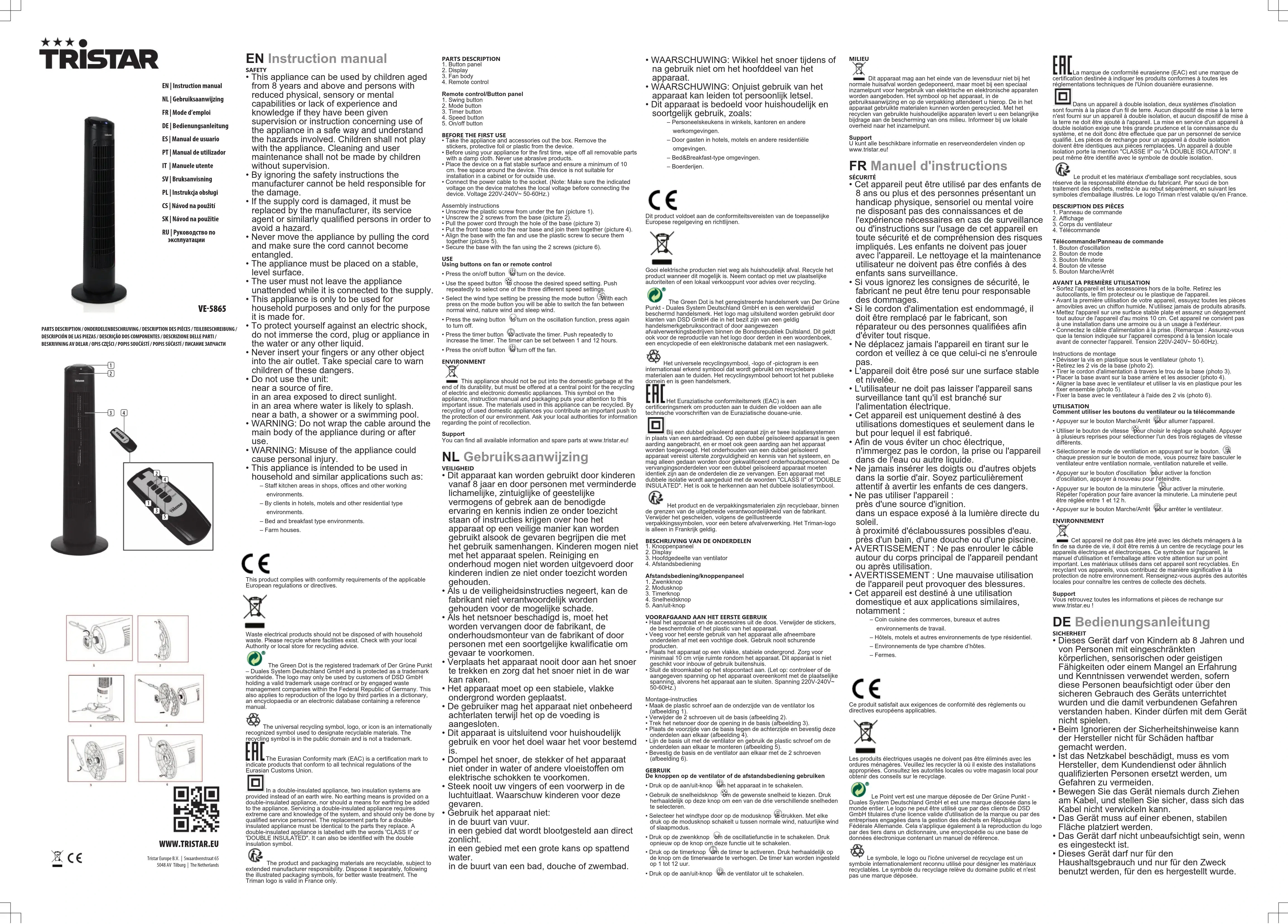 Téléchargez la notice de votre Ventilateur au format PDF gratuitement ! Retrouvez votre notice VE5865 - TRISTAR et reprennez votre appareil électronique en main. Sur cette page sont publiés tous les documents nécessaires à l'utilisation de votre appareil VE5865 de la marque TRISTAR.