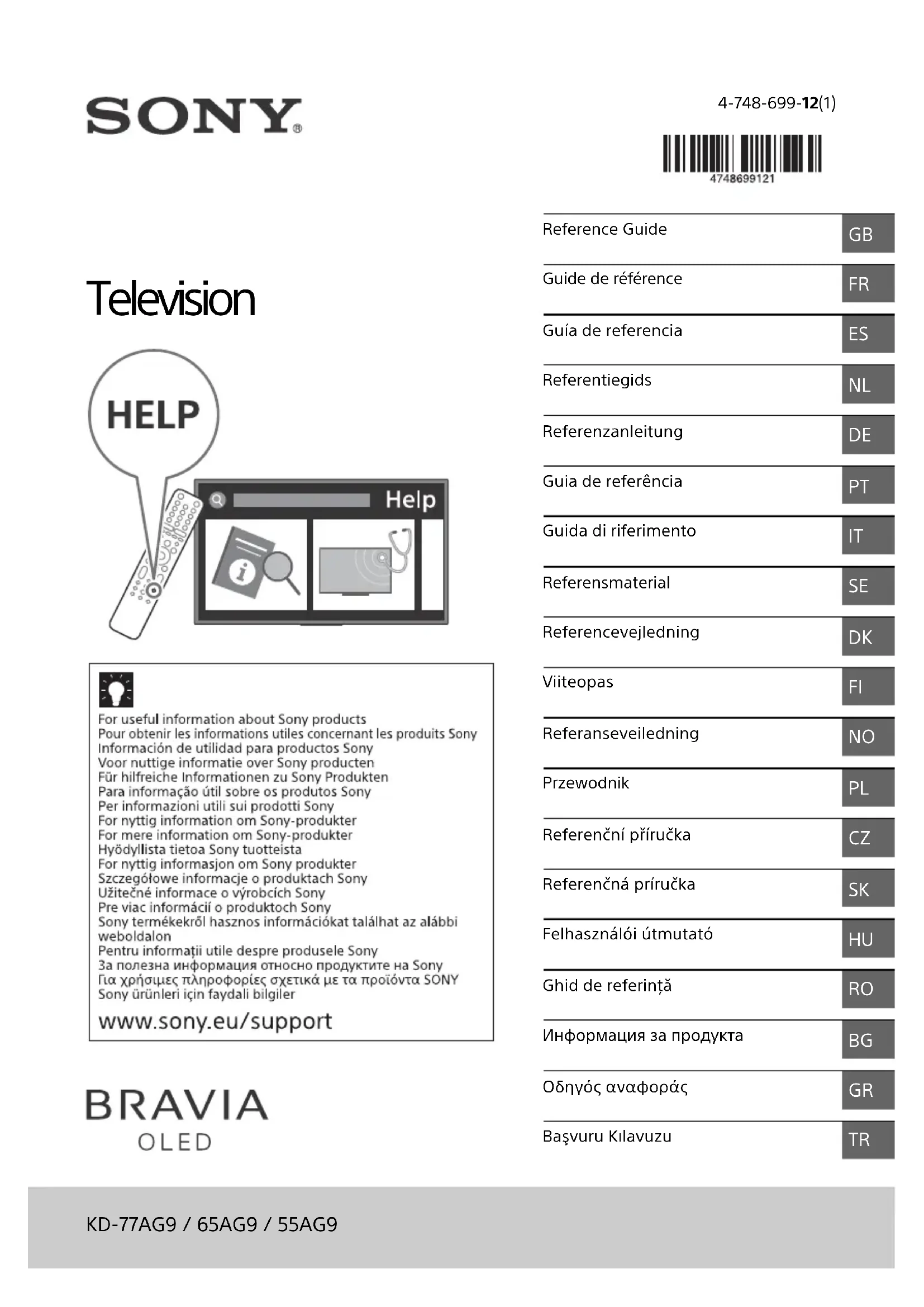 Avis concernant les équipements radio Le soussigné, Sony Visual Products Inc., déclare que les équipements radioélectriques de type KD-77AG9, KD-65AG9, KD-55AG9 sont conformes à la directive 2014/53/UE. Le texte complet de la déclaration UE de conformité est disponible à l’adresse internet suivante : http://www.compliance.sony.de/Avis aux clients : les informations suivantes s’appliquent uniquement aux appareils vendus dans les pays qui appliquent les directives de l’UE.Pour cet équipement radio, les restrictions de mise en service ou e demandes d’autorisation d’utilisation suivantes s’appliquent en AT, BE, HR, CY, CZ, DK, EE, FI, FR, DE, EL, HU, IE, IT, LV, LT, LU, MT, NL, PL, PT, SK, SI, ES, SE, UK, IS, LI, NO, CH, BG, RO, TR, AL, BA, MK, MD, RS, ME, Kosovo :La bande 5 150-5 350 MHz est limitée aux utilisations en intérieur uniquement. Pour attacher le support de table, reportez-vous au Gui de d’installation. Connexion Internet et confidentialité des donnéesCe produit se connecte à Internet au cours de la configuration initiale dès qu’un réseau est connecté afin de confirmer la connexion Internet, puis ultérieurement pour configurer l’écran d’accueil. Votre adresse IP est utilisée dans ces connexions Internet et toutes les autres. Si vous ne voulez pas que votre adresse IP soit utilisée, ne configurez pas la fonction Internet sans fil et ne connectez pas de câble Internet. Veuillez vous référer aux informations de confidentialité présentées dans les écrans de configuration pour en savoir plus sur les connexions Internet. Aide Vous trouverez des renseignements supplémentaires sur le dépannage et d’autres informations utiles directement sur votre téléviseur. Appuyez sur HELP sur la télécommande pour afficher une liste de thèmes ou cherchez par mot-clé. Guide d’aide (Manuel) Pour obtenir des informations supplémentaires, sélectionnez [Guide d'aide] du menu Aide sur votre téléviseur. Vous pouvez également consulter le Guide d’aide depuis votre PC ou smartphone (informations fournies sur le cache arrière de ce manuel). AVIS IMPORTANT3