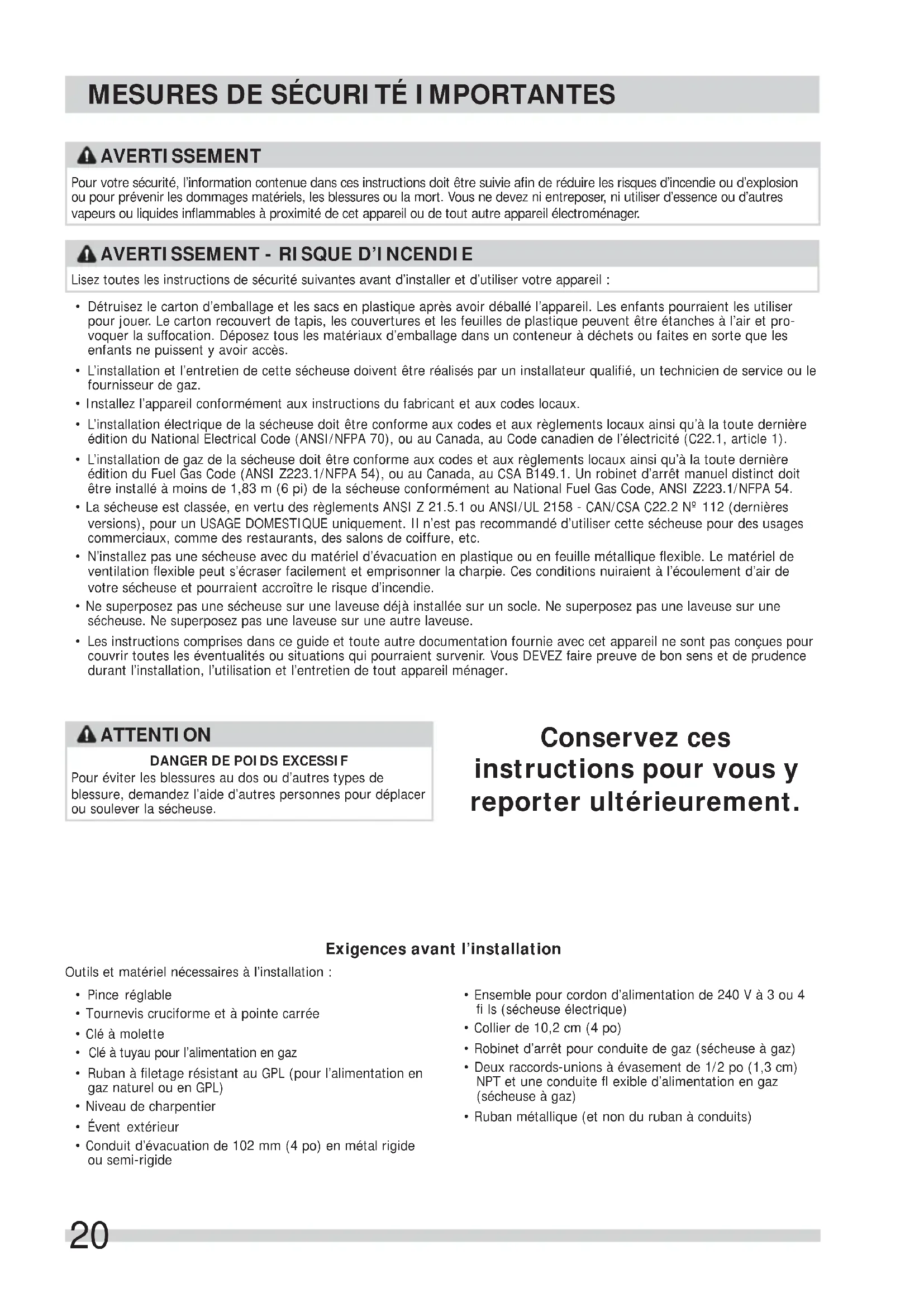 L'installation de gaz de la sécheuse doit être conforme aux codes et aux règlements locaux ainsi qu'à la toute dernière édition du Fuel Gas Code (ANSI Z223.1/NFPA 54), ou au Canada, au CSA B149.1.