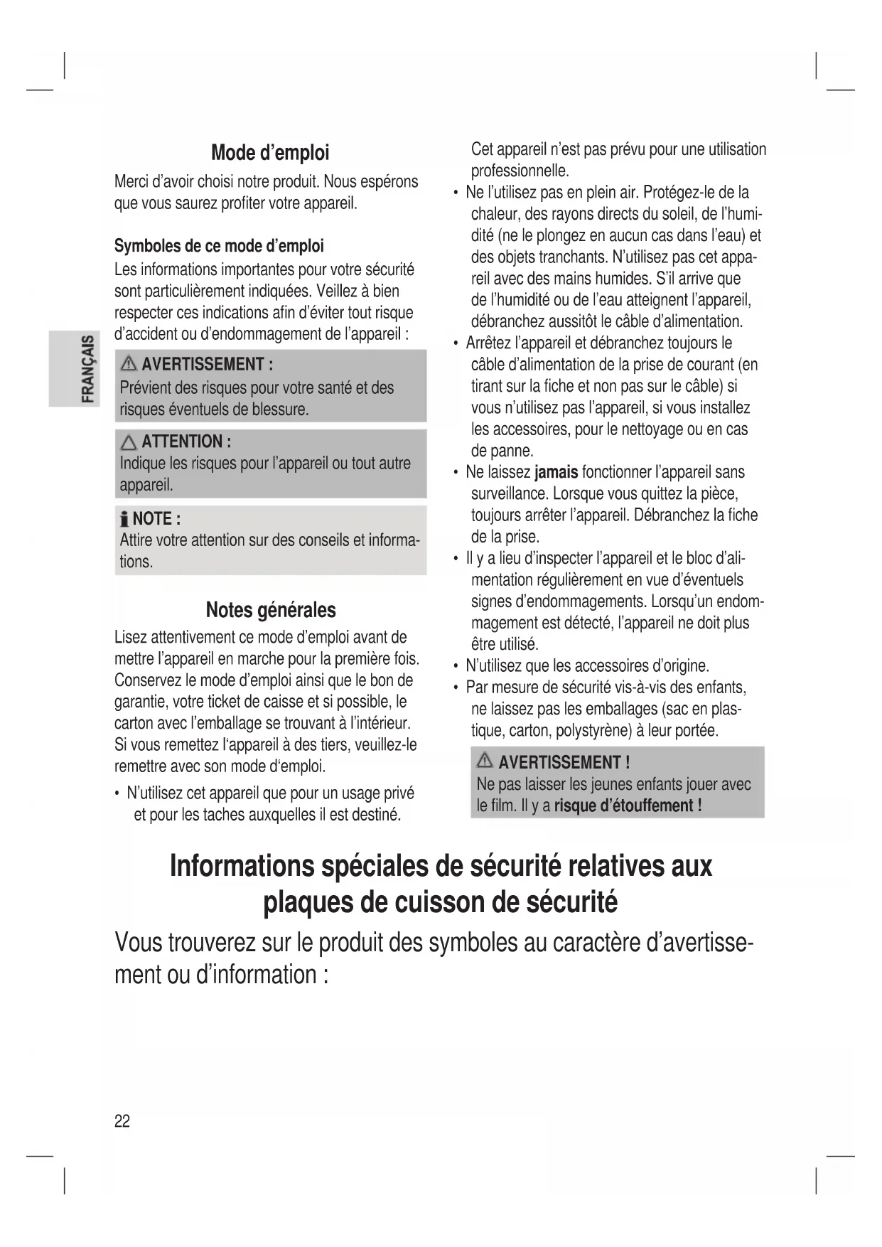 - Par mesure de sécurité vis-à-vis des enfants, ne laissez pas les emballages (sac en plas- tique, carton, polystyrène) à leur portée. AVERTISSEMENT ! Ne pas laisser les jeunes enfants jouer avec le film. Il y a risque d’étouffement ! Informations spéciales de sécurité relatives aux plaques de cuisson de sécurité Vous trouverez sur le produit des symboles au caractère d’avertisse- ment ou d’information :23
