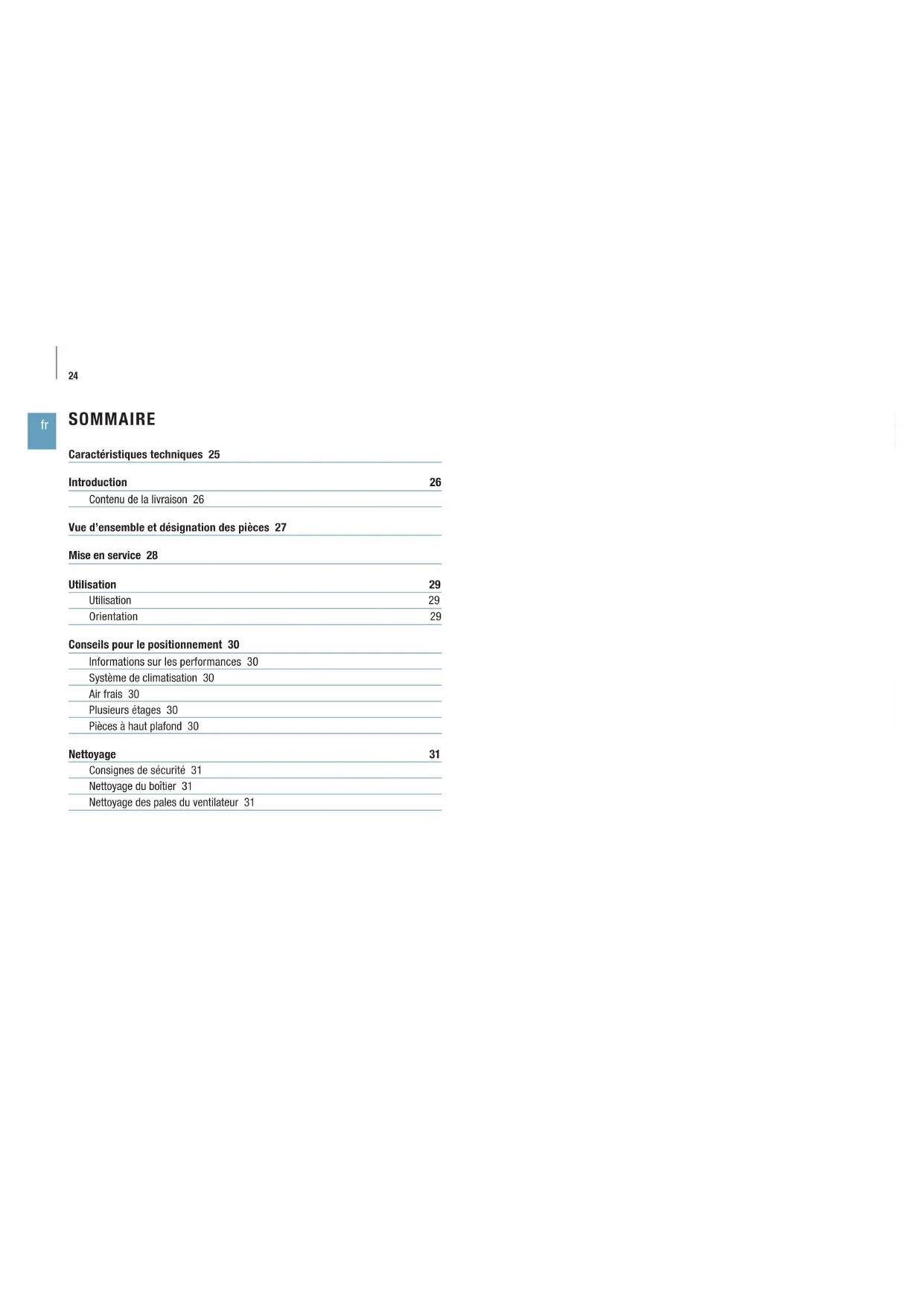 SOMMAIRE Caractéristiques techniques 25 Introduction 26 Contenu de la livraison 26 Vue d’ensemble et désignation des pièces 27 Mise en service 28 Utilisation 29 Utilisation 29 Orientation 29 Conseils pour le positionnement 30 Informations sur les performances 30 Système de climatisation 30 Air frais 30 Plusieurs étages 30 Pièces à haut plafond 30 Nettoyage 31 Consignes de sécurité 31 Nettoyage du boîtier 31 Nettoyage des pales du ventilateur 3125