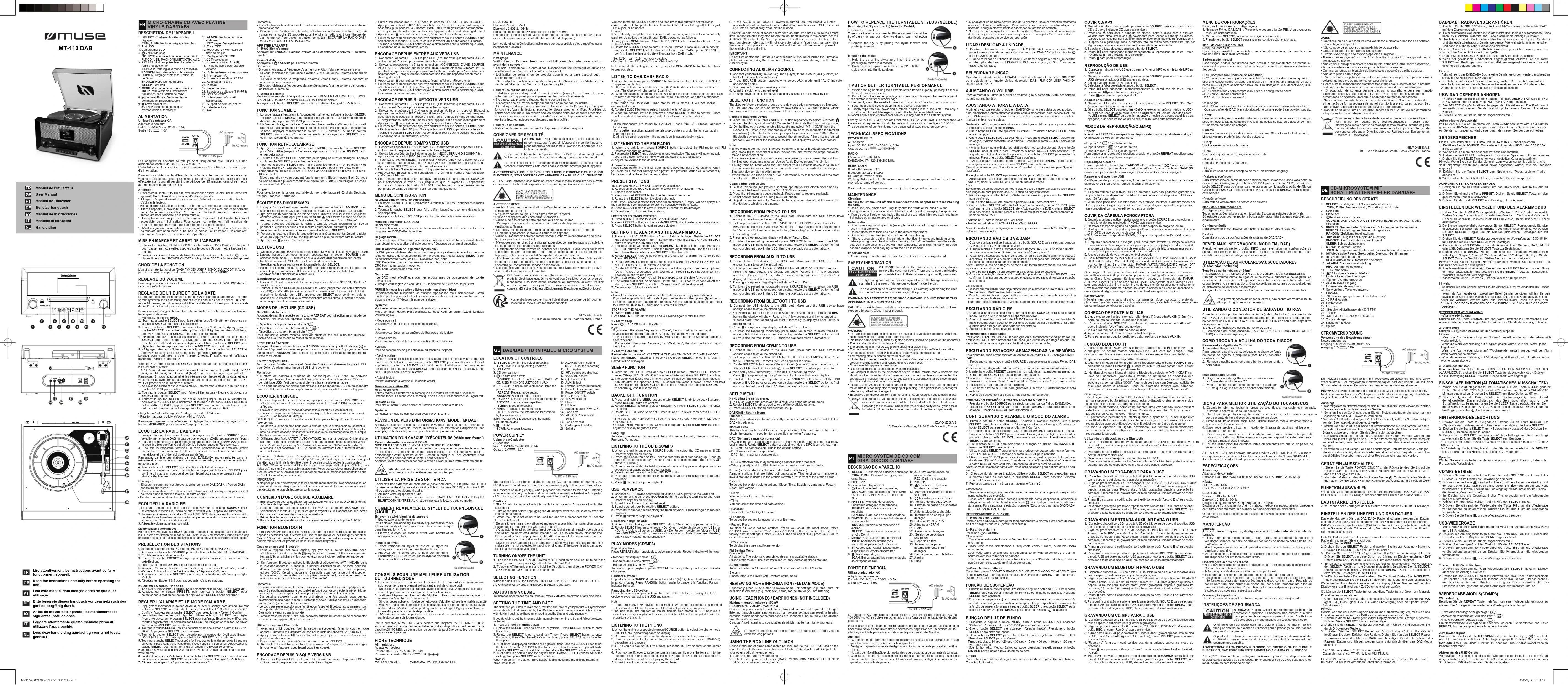 soigneusement, en le prenant soit au centre, soit de chaque côté.2. Ne touchez pas l'embout de l'aiguille avec les doigts, évitez de cogner l'aiguille contre le plateau du tourne-disque ou le rebord du disque.3. Nettoyez fréquemment l'embout de l'aiguille - utilisez une brosse douce avec un mouvement 'avant-arrière' uniquement.4. Si vous devez utiliser un liquide de nettoyage d'aiguille, utilisez-le en faible quantité.5. Essuyez doucement la protection de poussière et le boitier du tourne-disque avec un tissu doux. N'utilisez qu'une petite quantité de détergent léger pour nettoyer le tourne disque et le couvercle de poussière.6. N'appliquez jamais de produits chimiques ou de solvants abrasifs sur aucune partie du système de tourne-disque. Par la présente, NEW ONE S.A.S déclare que l'appareil "MUSE MT-110 DAB" est conforme aux exigences essentielles et autres dispositions pertinentes de la directive 2014/53/EU. La déclaration de conformité peut être consultée sur le site www.muse-europe.com.1. Quando for abrir ou fechar a tampa do toca-discos, manuseie com cuidado, utilizando o centro ou cada um dos lados.2. Não toque na ponta da agulha com os seus dedos; evite esbarrar a agulha contra o prato do toca-discos ou a quina de um disco.3. Limpe a agulha com frequência. Dica – utilize um pincel macio, movimentando-o apenas de “trás para frente”.