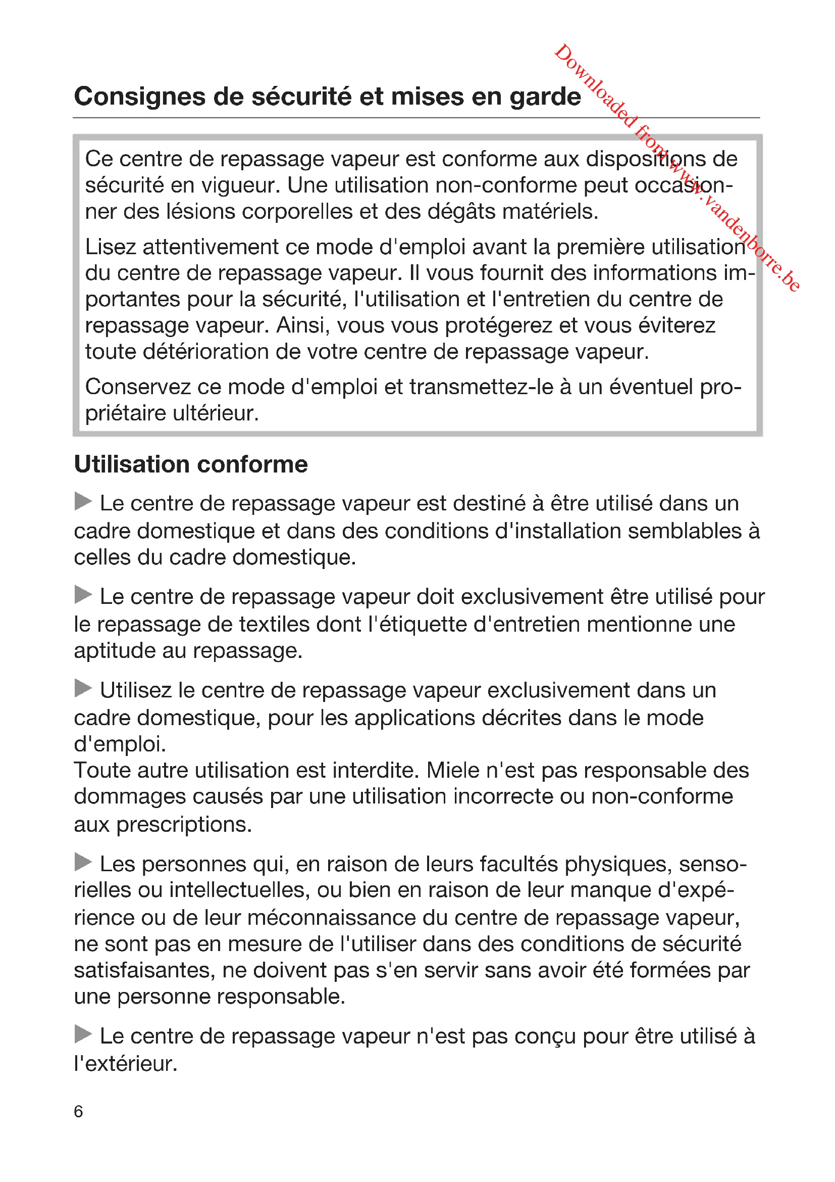 Ce centre de repassage vapeur est conforme aux dispositions de sécurité en vigueur. Une utilisation non-conforme peut occasion- ner des lésions corporelles et des dégâts matériels. Lisez attentivement ce mode d'emploi avant la première utilisation du centre de repassage vapeur. Il vous fournit des informations im- portantes pour la sécurité, l'utilisation et l'entretien du centre de repassage vapeur. Ainsi, vous vous protégerez et vous éviterez toute détérioration de votre centre de repassage vapeur. Conservez ce mode d'emploi et transmettez-le à un éventuel pro- priétaire ultérieur. Utilisation conforme Le centre de repassage vapeur est destiné à être utilisé dans un cadre domestique et dans des conditions d'installation semblables à celles du cadre domestique. Le centre de repassage vapeur doit exclusivement être utilisé pour le repassage de textiles dont l'étiquette d'entretien mentionne une aptitude au repassage. Utilisez le centre de repassage vapeur exclusivement dans un cadre domestique, pour les applications décrites dans le mode d'emploi. Toute autre utilisation est interdite. Miele n'est pas responsable des dommages causés par une utilisation incorrecte ou non-conforme aux prescriptions. Les personnes qui, en raison de leurs facultés physiques, senso- rielles ou intellectuelles, ou bien en raison de leur manque d'expé- rience ou de leur méconnaissance du centre de repassage vapeur, ne sont pas en mesure de l'utiliser dans des conditions de sécurité satisfaisantes, ne doivent pas s'en servir sans avoir été formées par une personne responsable. Le centre de repassage vapeur n'est pas conçu pour être utilisé à l'extérieur. Downloaded from www.vandenborre.beConsignes de sécurité et mises en garde