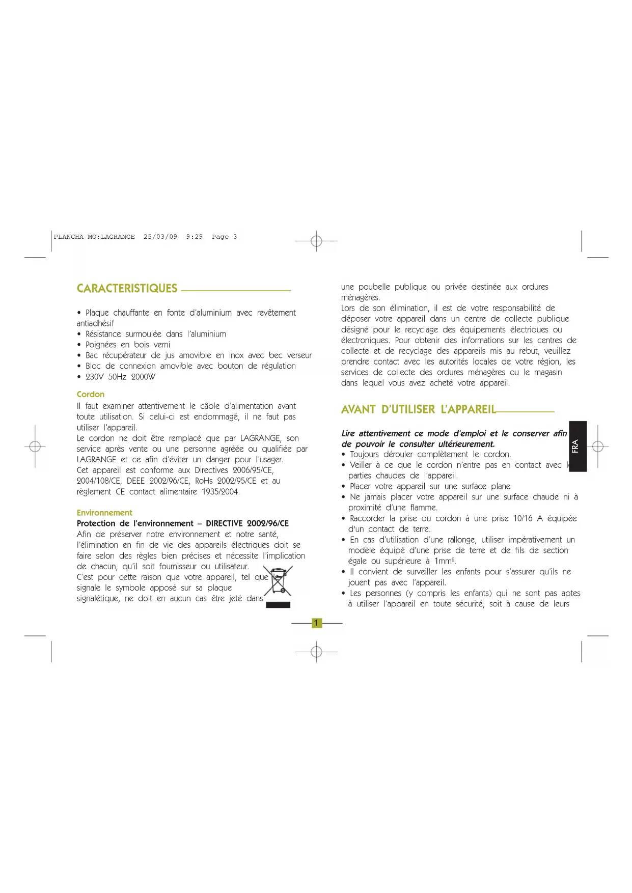 - 230V 50Hz 2000W Cordon Il faut examiner attentivement le câble d’alimentation avant toute utilisation. Si celui-ci est endommagé, il ne faut pas utiliser l’appareil. Le cordon ne doit être remplacé que par LAGRANGE, son service après vente ou une personne agréée ou qualifiée par LAGRANGE et ce afin d’éviter un danger pour l’usager. Cet appareil est conforme aux Directives 2006/95/CE, 2004/108/CE, DEEE 2002/96/CE, RoHs 2002/95/CE et au règlement CE contact alimentaire 1935/2004. Environnement Protection de l’environnement – DIRECTIVE 2002/96/CE Afin de préserver notre environnement et notre santé, l’élimination en fin de vie des appareils électriques doit se faire selon des règles bien précises et nécessite l’implication de chacun, qu’il soit fournisseur ou utilisateur. C’est pour cette raison que votre appareil, tel que le signale le symbole apposé sur sa plaque signalétique, ne doit en aucun cas être jeté dans une poubelle publique ou privée destinée aux ordures ménagères. Lors de son élimination, il est de votre responsabilité de déposer votre appareil dans un centre de collecte publique désigné pour le recyclage des équipements électriques ou électroniques. Pour obtenir des informations sur les centres de collecte et de recyclage des appareils mis au rebut, veuillez prendre contact avec les autorités locales de votre région, les services de collecte des ordures ménagères ou le magasin dans lequel vous avez acheté votre appareil.