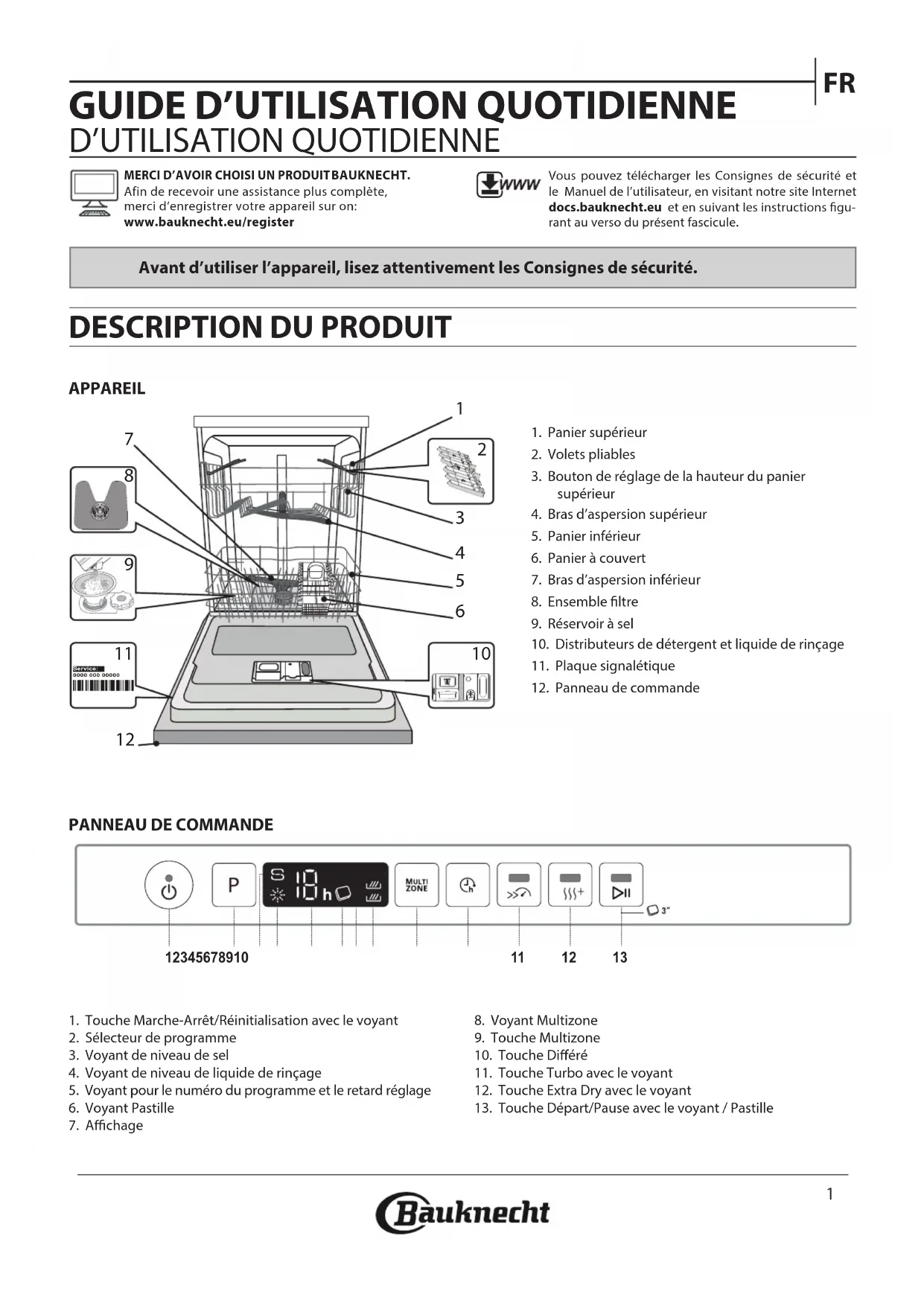 APPAREILPANNEAU DE COMMANDEMERCI D’AVOIR CHOISI UN PRODUIT BAUKNECHT Afin de recevoir une assistance plus complète, merci d’enregistrer votre appareil sur on: www.bauknecht.eu/registerVous pouvez télécharger les Consignes de sécurité et le Manuel de l’utilisateur, en visitant notre site Internet docs.bauknecht.eu et en suivant les instructions gu-rant au verso du présent fascicule.1. Panier supérieur2. Volets pliables3. Bouton de réglage de la hauteur du panier supérieur4. Bras d’aspersion supérieur5. Panier inférieur6. Panier à couvert7. Bras d’aspersion inférieur8. Ensemble ltre9. Réservoir à sel10. Distributeurs de détergent et liquide de rinçage11. Plaque signalétique12. Panneau de commande1. Touche Marche-Arrêt/Réinitialisation avec le voyant2. Sélecteur de programme3. Voyant de niveau de sel4. Voyant de niveau de liquide de rinçage5. Voyant pour le numéro du programme et le retard réglage6. Voyant Pastille7. Achage8. Voyant Multizone9. Touche Multizone10. Touche Diéré11. Touche Turbo avec le voyant12. Touche Extra Dry avec le voyant13. Touche Départ/Pause avec le voyant / Pastille1 2 3 4 5 6 7 8 9 1011 12 130000 000 00000 Service: