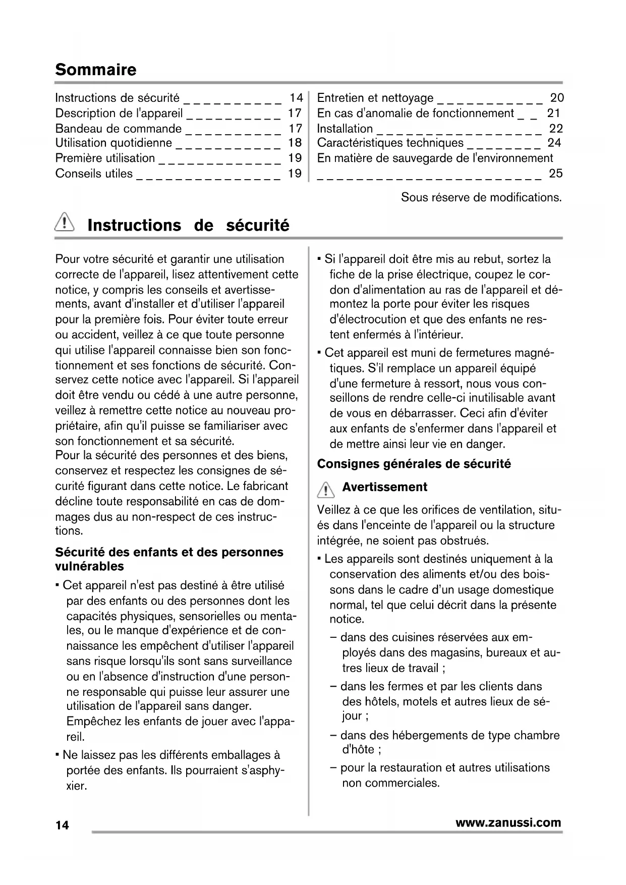 www.zanussi.comSommaire Instructions de sécurité _ _ _ _ _ _ _ _ _ _ 14 Description de l'appareil _ _ _ _ _ _ _ _ _ _ 17 Bandeau de commande _ _ _ _ _ _ _ _ _ _ 17 Utilisation quotidienne _ _ _ _ _ _ _ _ _ _ _ 18 Première utilisation _ _ _ _ _ _ _ _ _ _ _ _ _ 19 Conseils utiles _ _ _ _ _ _ _ _ _ _ _ _ _ _ _ 19 Entretien et nettoyage _ _ _ _ _ _ _ _ _ _ _ 20 En cas d'anomalie de fonctionnement _ _ 21 Installation _ _ _ _ _ _ _ _ _ _ _ _ _ _ _ _ _ 22 Caractéristiques techniques _ _ _ _ _ _ _ _ 24 En matière de sauvegarde de l'environnement _ _ _ _ _ _ _ _ _ _ _ _ _ _ _ _ _ _ _ _ _ _ _ 25 Sous réserve de modifications. Instructions de sécurité Pour votre sécurité et garantir une utilisation correcte de l'appareil, lisez attentivement cette notice, y compris les conseils et avertisse- ments, avant d'installer et d'utiliser l'appareil pour la première fois. Pour éviter toute erreur ou accident, veillez à ce que toute personne qui utilise l'appareil connaisse bien son fonc- tionnement et ses fonctions de sécurité. Con- servez cette notice avec l'appareil. Si l'appareil doit être vendu ou cédé à une autre personne, veillez à remettre cette notice au nouveau pro- priétaire, afin qu'il puisse se familiariser avec son fonctionnement et sa sécurité. Pour la sécurité des personnes et des biens, conservez et respectez les consignes de sé- curité figurant dans cette notice. Le fabricant décline toute responsabilité en cas de dom- mages dus au non-respect de ces instruc- tions. Sécurité des enfants et des personnes vulnérables