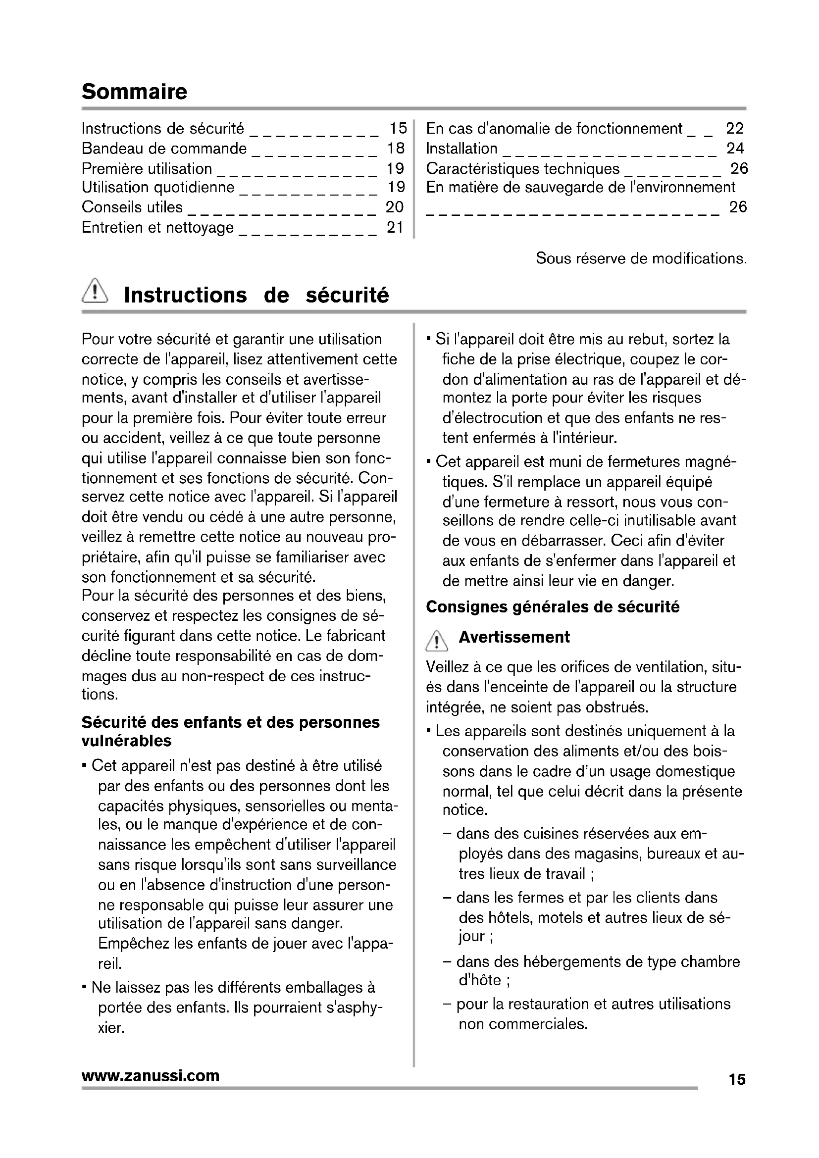 www.zanussi.comSommaire Instructions de sécurité _ _ _ _ _ _ _ _ _ _ 15 Bandeau de commande _ _ _ _ _ _ _ _ _ _ 18 Première utilisation _ _ _ _ _ _ _ _ _ _ _ _ _ 19 Utilisation quotidienne _ _ _ _ _ _ _ _ _ _ _ 19 Conseils utiles _ _ _ _ _ _ _ _ _ _ _ _ _ _ _ 20 Entretien et nettoyage _ _ _ _ _ _ _ _ _ _ _ 21 En cas d'anomalie de fonctionnement _ _ 22 Installation _ _ _ _ _ _ _ _ _ _ _ _ _ _ _ _ _ 24 Caractéristiques techniques _ _ _ _ _ _ _ _ 26 En matière de sauvegarde de l'environnement _ _ _ _ _ _ _ _ _ _ _ _ _ _ _ _ _ _ _ _ _ _ _ 26 Sous réserve de modifications. Instructions de sécurité Pour votre sécurité et garantir une utilisation correcte de l'appareil, lisez attentivement cette notice, y compris les conseils et avertisse- ments, avant d'installer et d'utiliser l'appareil pour la première fois. Pour éviter toute erreur ou accident, veillez à ce que toute personne qui utilise l'appareil connaisse bien son fonc- tionnement et ses fonctions de sécurité. Con- servez cette notice avec l'appareil. Si l'appareil doit être vendu ou cédé à une autre personne, veillez à remettre cette notice au nouveau pro- priétaire, afin qu'il puisse se familiariser avec son fonctionnement et sa sécurité. Pour la sécurité des personnes et des biens, conservez et respectez les consignes de sé- curité figurant dans cette notice. Le fabricant décline toute responsabilité en cas de dom- mages dus au non-respect de ces instruc- tions. Sécurité des enfants et des personnes vulnérables