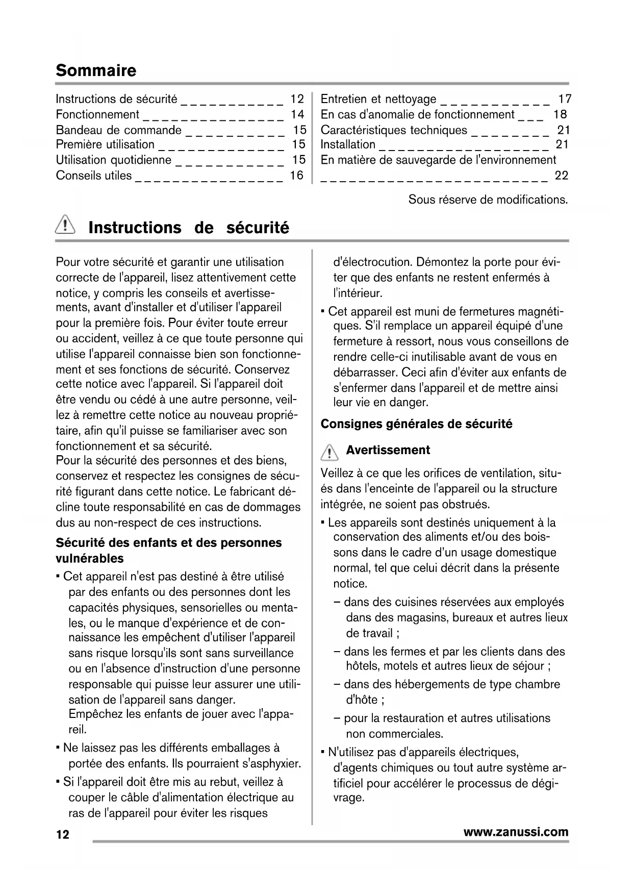 www.zanussi.comSommaire Instructions de sécurité _ _ _ _ _ _ _ _ _ _ _ 12 Fonctionnement _ _ _ _ _ _ _ _ _ _ _ _ _ _ _ 14 Bandeau de commande _ _ _ _ _ _ _ _ _ _ 15 Première utilisation _ _ _ _ _ _ _ _ _ _ _ _ _ 15 Utilisation quotidienne _ _ _ _ _ _ _ _ _ _ _ 15 Conseils utiles _ _ _ _ _ _ _ _ _ _ _ _ _ _ _ _ 16 Entretien et nettoyage _ _ _ _ _ _ _ _ _ _ _ 17 En cas d'anomalie de fonctionnement _ _ _ 18 Caractéristiques techniques _ _ _ _ _ _ _ _ 21 Installation _ _ _ _ _ _ _ _ _ _ _ _ _ _ _ _ _ _ 21 En matière de sauvegarde de l'environnement _ _ _ _ _ _ _ _ _ _ _ _ _ _ _ _ _ _ _ _ _ _ _ _ 22 Sous réserve de modifications. Instructions de sécurité Pour votre sécurité et garantir une utilisation correcte de l'appareil, lisez attentivement cette notice, y compris les conseils et avertisse- ments, avant d'installer et d'utiliser l'appareil pour la première fois. Pour éviter toute erreur ou accident, veillez à ce que toute personne qui utilise l'appareil connaisse bien son fonctionne- ment et ses fonctions de sécurité. Conservez cette notice avec l'appareil. Si l'appareil doit être vendu ou cédé à une autre personne, veil- lez à remettre cette notice au nouveau proprié- taire, afin qu'il puisse se familiariser avec son fonctionnement et sa sécurité. Pour la sécurité des personnes et des biens, conservez et respectez les consignes de sécu- rité figurant dans cette notice. Le fabricant dé- cline toute responsabilité en cas de dommages dus au non-respect de ces instructions. Sécurité des enfants et des personnes vulnérables