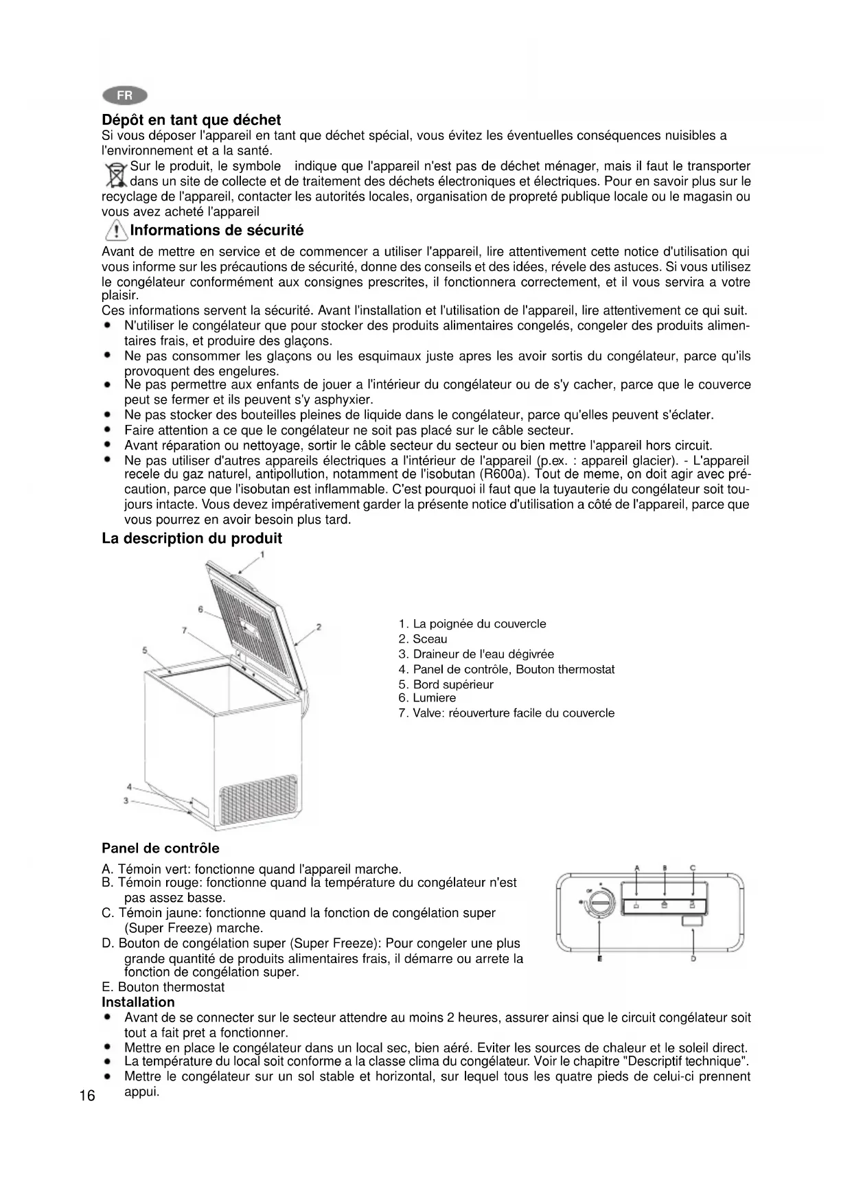 Dépôt en tant que déchet Si vous déposer l'appareil en tant que déchet spécial, vous évitez les éventuelles conséquences nuisibles a l'environnement et a la santé. Sur le produit, le symbole indique que l'appareil n'est pas de déchet ménager, mais il faut le transporter dans un site de collecte et de traitement des déchets électroniques et électriques. Pour en savoir plus sur le recyclage de l'appareil, contacter les autorités locales, organisation de propreté publique locale ou le magasin ou vous avez acheté l'appareil Informations de sécurité Avant de mettre en service et de commencer a utiliser l'appareil, lire attentivement cette notice d'utilisation qui vous informe sur les précautions de sécurité, donne des conseils et des idées, révele des astuces. Si vous utilisez le congélateur conformément aux consignes prescrites, il fonctionnera correctement, et il vous servira a votre plaisir. Ces informations servent la sécurité. Avant l'installation et l'utilisation de l'appareil, lire attentivement ce qui suit. N'utiliser le congélateur que pour stocker des produits alimentaires congelés, congeler des produits alimen- taires frais, et produire des glaçons. Ne pas consommer les glaçons ou les esquimaux juste apres les avoir sortis du congélateur, parce qu'ils provoquent des engelures. Ne pas permettre aux enfants de jouer a l'intérieur du congélateur ou de s'y cacher, parce que le couverce peut se fermer et ils peuvent s'y asphyxier. Ne pas stocker des bouteilles pleines de liquide dans le congélateur, parce qu'elles peuvent s'éclater. Faire attention a ce que le congélateur ne soit pas placé sur le câble secteur. Avant réparation ou nettoyage, sortir le câble secteur du secteur ou bien mettre l'appareil hors circuit. Ne pas utiliser d'autres appareils électriques a l'intérieur de l'appareil (p.ex. : appareil glacier). - L'appareil recele du gaz naturel, antipollution, notamment de l'isobutan (R600a). Tout de meme, on doit agir avec pré- caution, parce que l'isobutan est inflammable. C'est pourquoi il faut que la tuyauterie du congélateur soit tou- jours intacte. Vous devez impérativement garder la présente notice d'utilisation a côté de l'appareil, parce que vous pourrez en avoir besoin plus tard. La description du produit Panel de contrôle A. Témoin vert: fonctionne quand l'appareil marche. B. Témoin rouge: fonctionne quand la température du congélateur n'est pas assez basse. C. Témoin jaune: fonctionne quand la fonction de congélation super (Super Freeze) marche. D. Bouton de congélation super (Super Freeze): Pour congeler une plus grande quantité de produits alimentaires frais, il démarre ou arrete la fonction de congélation super. E. Bouton thermostat Installation Avant de se connecter sur le secteur attendre au moins 2 heures, assurer ainsi que le circuit congélateur soit tout a fait pret a fonctionner. Mettre en place le congélateur dans un local sec, bien aéré. Eviter les sources de chaleur et le soleil direct. La température du local soit conforme a la classe clima du congélateur. Voir le chapitre "Descriptif technique". Mettre le congélateur sur un sol stable et horizontal, sur lequel tous les quatre pieds de celui-ci prennent appui.