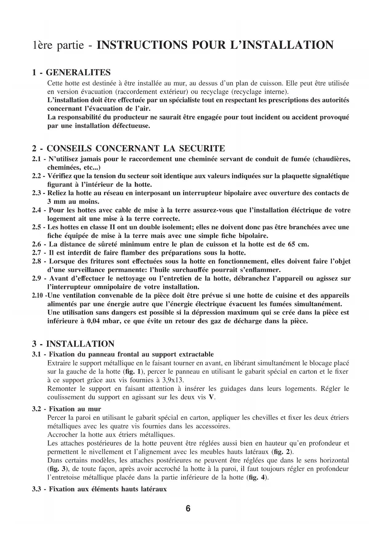 Cette hotte est destinée à être installée au mur, au dessus d’un plan de cuisson. Elle peut être utilisée en version évacuation (raccordement extérieur) ou recyclage (recyclage interne). L’installation doit être effectuée par un spécialiste tout en respectant les prescriptions des autorités concernant l’évacuation de l’air. La responsabilité du producteur ne saurait être engagée pour tout incident ou accident provoqué par une installation défectueuse.