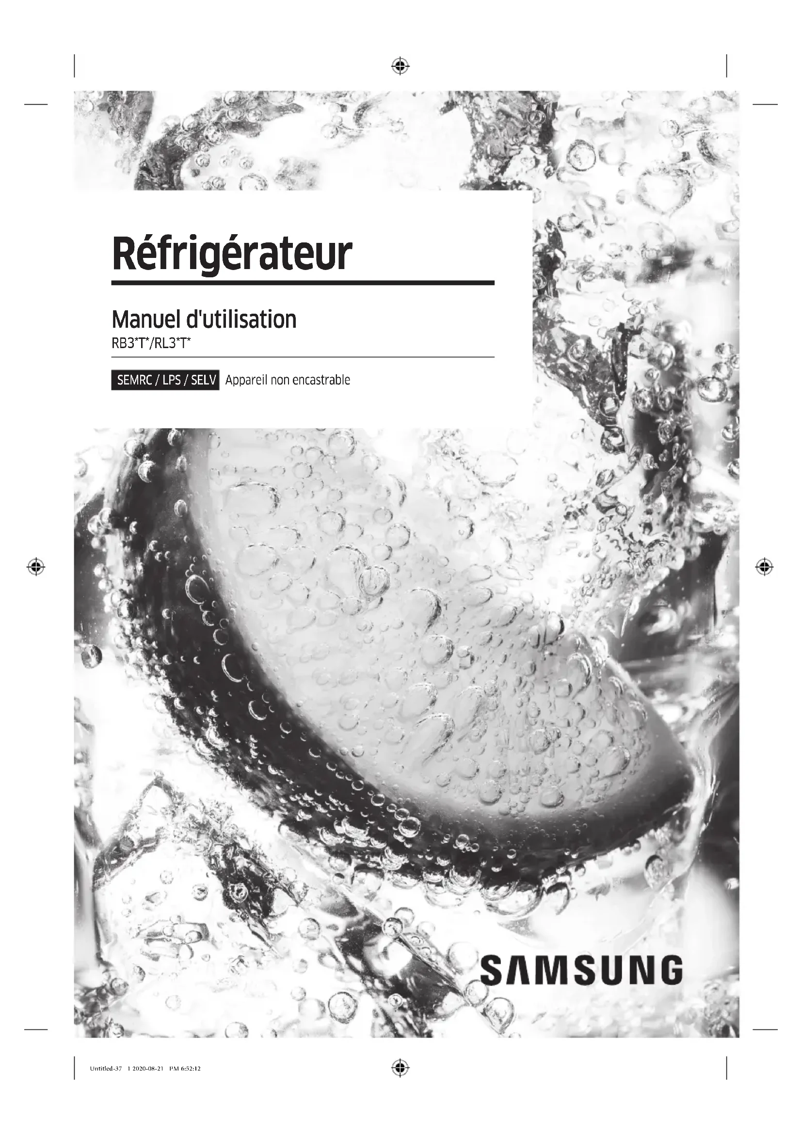 www.samsung.com/levant/support DA68-04111V-00 Untitled-38 68 2020-08-21 PM 6:54:42Réfrigérateur Manuel d'utilisation RB3*T*/RL3*T* SEMRC / LPS / SELV Appareil non encastrable Untitled-37 1 2020-08-21 PM 6:52:12Français2 Sommaire Sommaire Consignes de sécurité 3 Ce que vous devez savoir concernant les consignes de sécurité 3 Consignes et symboles de sécurité importants : 6 Mesures importantes de sécurité 7 Symboles d'avertissement importants concernant le transport et le lieu d'installation de l'appareil 11 Avertissements importants concernant l'installation 11 Consignes d'installation 16 Avertissements importants concernant l'utilisation 16 Consignes d'utilisation 22 Consignes de nettoyage 26 Avertissements importants concernant la mise au rebut 28 Conseils complémentaires pour une utilisation appropriée 29 Instructions concernant la règlementation DEEE 31 Installation 32 Présentation rapide du réfrigérateur 32 Installation étape par étape 33 Opérations 39 Panneau de commande 39 Fonctions spéciales 41 Conseils de stockage pour une préservation optimale 45 Maintenance 48 Inversion de la position de la poignée de la porte (pour les modèles équipés de poignées barres) 48 Inversion de la porte (modèles applicables uniquement) 49 Utilisation et entretien 63 Nettoyage 65 Remplacement 65 Dépannage 66 Généralités 66 Entendez-vous des sons anormaux provenant du réfrigérateur ? 68 Untitled-37 2 2020-08-21 PM 6:52:12Français 3 Consignes de sécurité Avant d'utiliser votre nouveau réfrigérateur Samsung, veuillez lire attentivement ce manuel an de vous assurer que vous savez comment utiliser de manière sûre et efcace ses différentes fonctions et fonctionnalités. Ce que vous devez savoir concernant les consignes de sécurité