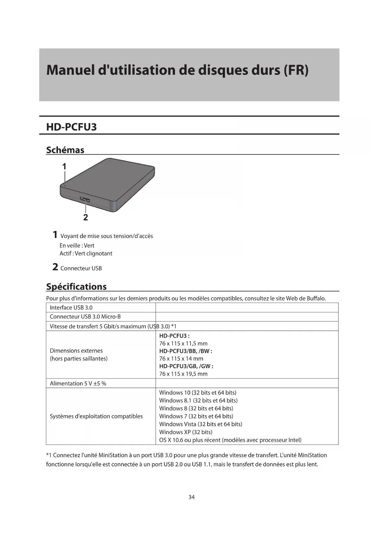 1 Voyant de mise sous tension/d'accès En veille: Bleu Actif: Bleu clignotant 2 ConnecteurUSB37 Spécifications Pour plus d'informations sur les derniers produits ou les modèles compatibles, consultez le site Web de Buffalo. Interface USB2.0 Connecteur USB 2.0 Mini-B Vitesse de transfert 480Mbit/s maximum (USB2.0)*1 Dimensions externes (hors parties saillantes) HD-PCTU2, HD-PCU2: 77x114x14mm HD-PCTU2/BB, HD-PCU2/BB: 77x114x17mm Alimentation 5V ±5% Systèmes d'exploitation compatibles Windows8 (32bits et 64bits) Windows7 (32bits et 64bits) WindowsVista (32bits et 64bits) WindowsXP (32bits) OS X 10.8, 10.7, 10.6, 10.5, 10.4 (modèles avec processeur Intel) *1Connectez l'unité MiniStation à un port USB2.0 pour une plus grande vitesse de transfert. L'unité MiniStation fonctionne si elle est connectée à un port USB1.1, mais le transfert de données est plus lent. Utilisation recommandée Avertissement Pour éviter tout dommage des données, n'effectuez jamais aucune des opérations suivantes lorsque les données sont en cours d'accès: -Débrancher les câbles -Mettre l'ordinateur hors tension -Régler votre ordinateur en mode veille, hibernation ou sommeil -Vous déconnecter, vous connecter ou changer d'utilisateur Ne configurez jamais cette unité comme destination de mémoire virtuelle. Sur un disque dur FAT32, la taille maximale d'un fichier est de 4Go. Pour manipuler des fichiers de taille supérieure, reformatez le disque avec NTFS ou MacOSExtended. Il se peut que MacOS ne reconnaisse pas ce périphérique au démarrage. Le cas échéant, débranchez le câble, puis rebranchez-le au bout de quelques secondes. Cette unité est compatible avec le branchement à chaud (hot-plug). Cela signifie que vous pouvez brancher ou débrancher le câbleUSB pendant que l'unité et l'ordinateur sont en marche. Cependant, ne débranchez jamais le câble lorsque les données sont en cours d'accès. Si vous débranchez l'unité alors que les données sont en cours d'accès, ces dernières risquent d'être endommagées ou perdues. N'appuyez aucun objet contre cette unité. En effet, cela risque de causer un dysfonctionnement.38 Si l'unité est branchée sur une prise USB2.0 ou1.1, Windows affiche un message indiquant qu'un dispositifUSB haut débit est raccordé à un concentrateurUSB faible débit. Pour obtenir des performances optimales, branchez l'unité sur un port USB3.0, ou cliquez sur [X] pour continuer. L'unité peut émettre certains bruits lorsqu'elle est en fonctionnement, en particulier au démarrage ou lors des accès. Cela est normal. Avant de réinstaller MacOS, débranchez le disque. Ne redémarrez pas votre système d'exploitation à partir de cette unité. La première fois que vous connectez l'unité, il peut s'écouler environ 20secondes avant que le voyant de mise sous tension/d'accès s'allume. Si vous utilisez l'unité avec plusieurs partitions, formatez chacune d'elles avant utilisation. Si votre ordinateurWindows ne démarre pas alors que l'unité est connectée, connectez cette dernière à l'ordinateur après avoir redémarré Windows. Par ailleurs, consultez le manuel de votre ordinateur pour déterminer comment modifier le paramètre du BIOS relatif au démarrage à partir d'un disque dur interne si vous souhaitez mettre en marche et arrêter l'ordinateur en laissant l'unité connectée. Lorsqu'ils sortent d'un état d'économie d'énergie, certains ordinateurs peuvent signaler une erreur d'écriture différée. Si cela se produit, débranchez l'unité avant de mettre l'ordinateur en mode économie d'énergie. Ce disque peut chauffer en cours d'utilisation. Cette unité est conçue pour évacuer la chaleur à travers son boîtier. La surface du boîtier peut devenir assez chaude lors d'une utilisation normale. Même lorsque l'unité est mise hors tension, le boîtier peut rester chaud à cause du courant de veille. Si le voyant de mise sous tension/d'accès ne s'éteint pas lorsque vous mettez votre ordinateur hors tension, débranchez le câbleUSB du disque. Certains ordinateurs ne prennent pas en charge le mode économie d'énergie. Avant d'utiliser cette unité avec un Mac, reformatez-la avec MacOSExtended à l'aide de l'utilitaire de disque de MacOS. Désinstallation de l'unité Si l'unité est débranchée de manière incorrecte, les données risquent d'être corrompues. Faites attention! Si votre ordinateur est hors tension, il est toujours plus sûr de débrancher l'unité. Si votre ordinateur est sous tension, veuillez suivre la procédure ci-dessous pour débrancher l'unité. Windows 1 Cliquez sur l'icône , , ou dans la barre d'état système.39 2 Lorsque le menu s'ouvre, cliquez sur le nom du dispositif. 3 Un message apparaît, vous indiquant que vous pouvez débrancher l'unité en toute sécurité. Mac 1 Pour désinstaller le disque, faites glisser l'icône de l'unité dans la corbeille. 2 Vous pouvez maintenant débrancher l'unité de votre Mac en toute sécurité. Dépannage L'unitéDriveStation ou MiniStation apparaît dans le Poste de travail, mais je ne peux pas y accéder. (Windows) Il est possible que le disque doive être formaté. Essayez d'utiliser DiskFormatter2. Pour plus d'informations, consultez le manuel de DiskFormatter2. L'unité DriveStation ou MiniStation n'apparaît pas. Vérifiez que le voyant de mise sous tension est allumé. Si ce n'est pas le cas, vérifiez que l'interrupteur d'alimentation est placé sur la position ON (MARCHE). Vérifiez vos câbles! L'unité DriveStation ou MiniStation doit être branchée à votre ordinateur à l'aide d'un câbleUSB. Vérifiez que les deux extrémités sont correctement branchées. Vérifiez que le disque dur de l'unité DriveStation ou MiniStation tourne. Pour ce faire, posez votre main sur le côté du boîtier; vous devez normalement ressentir une légère vibration. De plus, l'unité DriveStation ou MiniStation commence à chauffer au bout d'au moins 15minutes de mise sous tension. Si aucun des