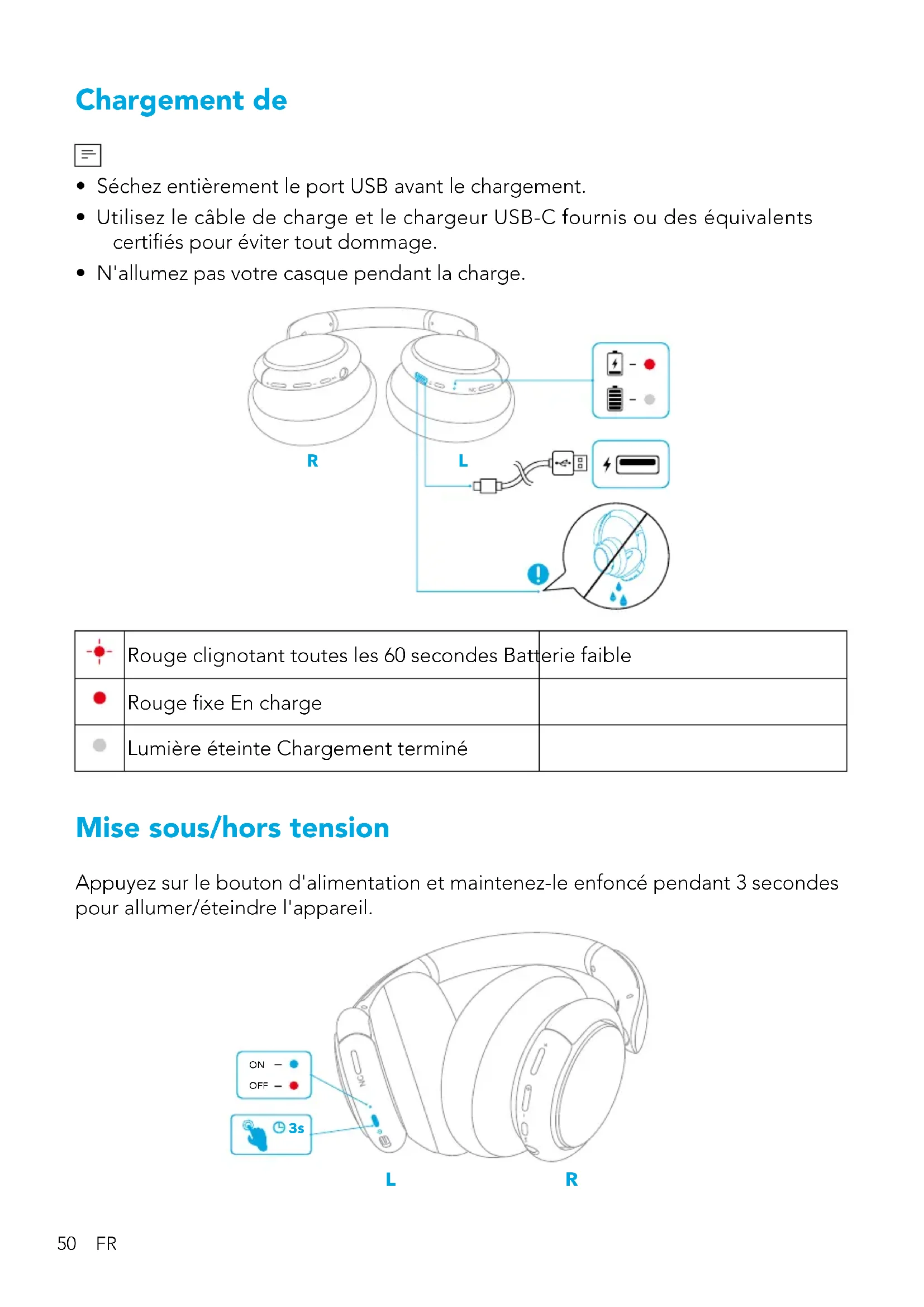 - N'allumez pas votre casque pendant la charge. R L Rouge clignotant toutes les 60 secondes Batterie faible Rouge xe En charge Lumière éteinte Chargement terminé Mise sous/hors tension Appuyez sur le bouton d'alimentation et maintenez-le enfoncé pendant 3 secondes pour allumer/éteindre l'appareil.