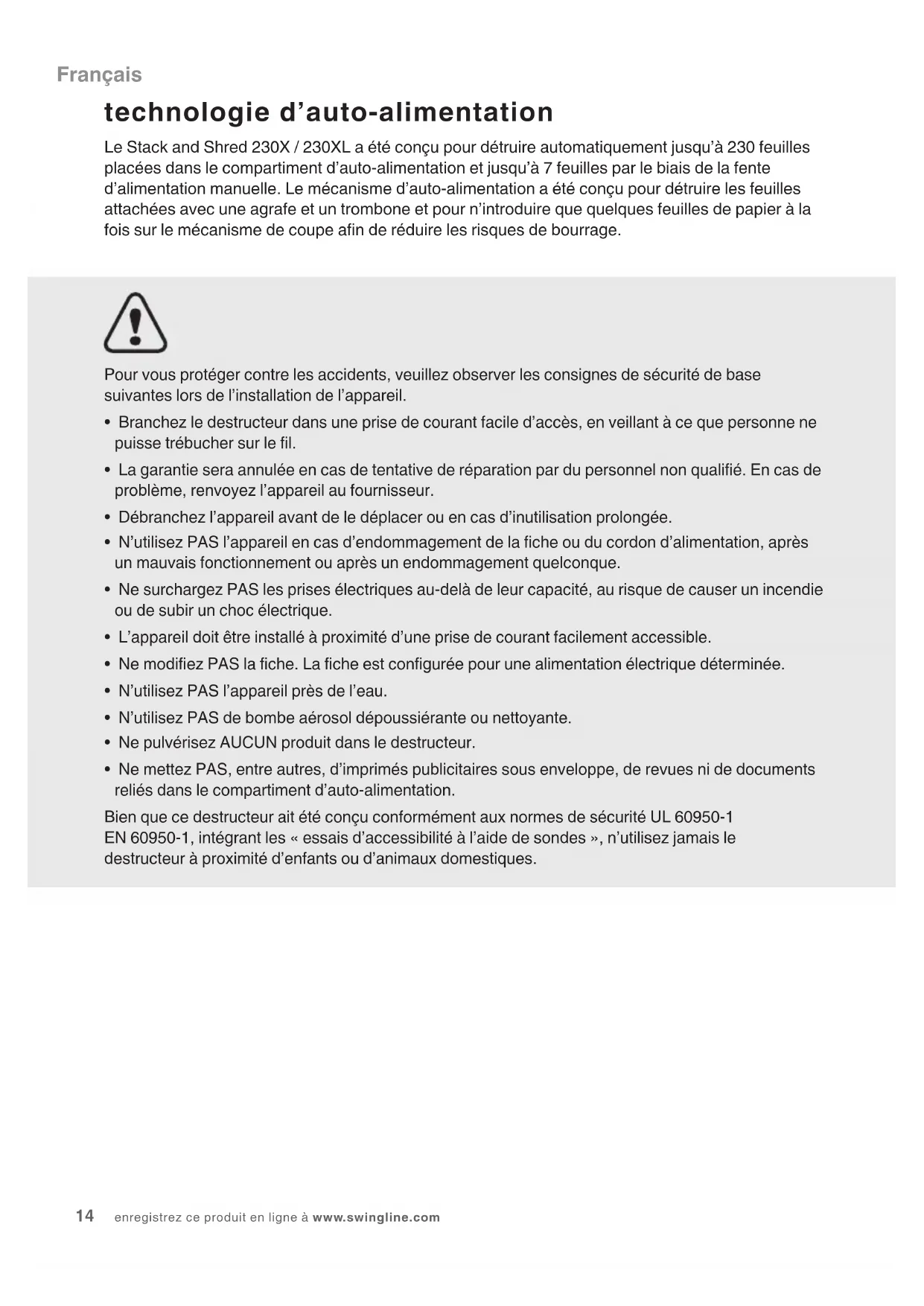 - Ne mettez PAS, entre autres, d’imprimés publicitaires sous enveloppe, de revues ni de documents reliés dans le compartiment d’auto-alimentation. Bien que ce destructeur ait été conçu conformément aux normes de sécurité UL 60950-1 EN 60950-1, intégrant les « essais d’accessibilité à l’aide de sondes », n’utilisez jamais le destructeur à proximité d’enfants ou d’animaux domestiques. technologie d’auto-alimentation Le Stack and Shred 230X / 230XL a été conçu pour détruire automatiquement jusqu’à 230 feuilles placées dans le compartiment d’auto-alimentation et jusqu’à 7 feuilles par le biais de la fente d’alimentation manuelle. Le mécanisme d’auto-alimentation a été conçu pour détruire les feuilles attachées avec une agrafe et un trombone et pour n’introduire que quelques feuilles de papier à la fois sur le mécanisme de coupe an de réduire les risques de bourrage. FrançaisSTACK-AND-SHRED 230X&230XL