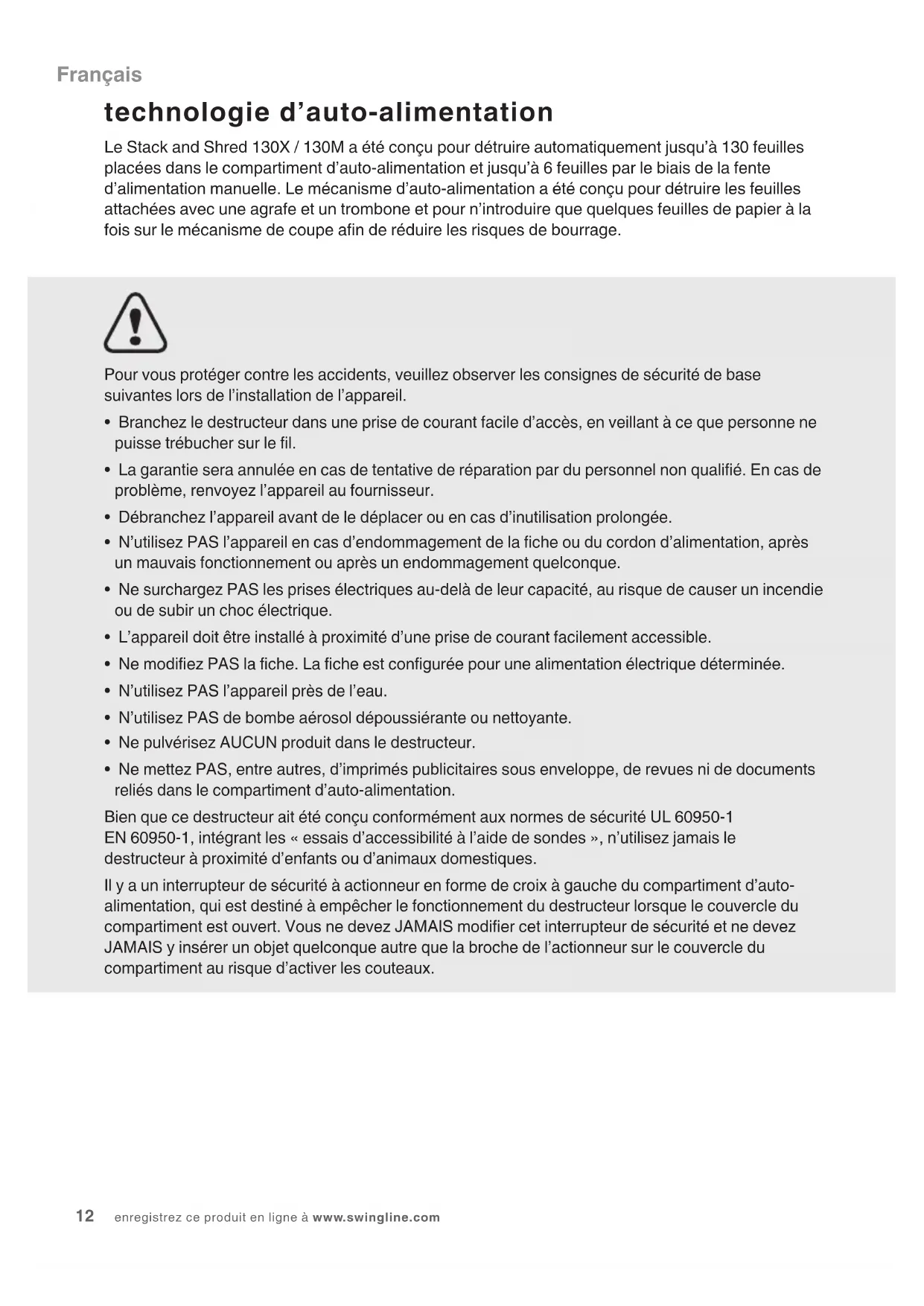 - Ne mettez PAS, entre autres, d’imprimés publicitaires sous enveloppe, de revues ni de documents reliés dans le compartiment d’auto-alimentation. Bien que ce destructeur ait été conçu conformément aux normes de sécurité UL 60950-1 EN 60950-1, intégrant les « essais d’accessibilité à l’aide de sondes », n’utilisez jamais le destructeur à proximité d’enfants ou d’animaux domestiques. Il y a un interrupteur de sécurité à actionneur en forme de croix à gauche du compartiment d’auto- alimentation, qui est destiné à empêcher le fonctionnement du destructeur lorsque le couvercle du compartiment est ouvert. Vous ne devez JAMAIS modier cet interrupteur de sécurité et ne devez JAMAIS y insérer un objet quelconque autre que la broche de l’actionneur sur le couvercle du compartiment au risque d’activer les couteaux. technologie d’auto-alimentation Le Stack and Shred 130X / 130M a été conçu pour détruire automatiquement jusqu’à 130 feuilles placées dans le compartiment d’auto-alimentation et jusqu’à 6 feuilles par le biais de la fente d’alimentation manuelle. Le mécanisme d’auto-alimentation a été conçu pour détruire les feuilles attachées avec une agrafe et un trombone et pour n’introduire que quelques feuilles de papier à la fois sur le mécanisme de coupe an de réduire les risques de bourrage. FrançaisSTACK-AND-SHRED 130X&130M