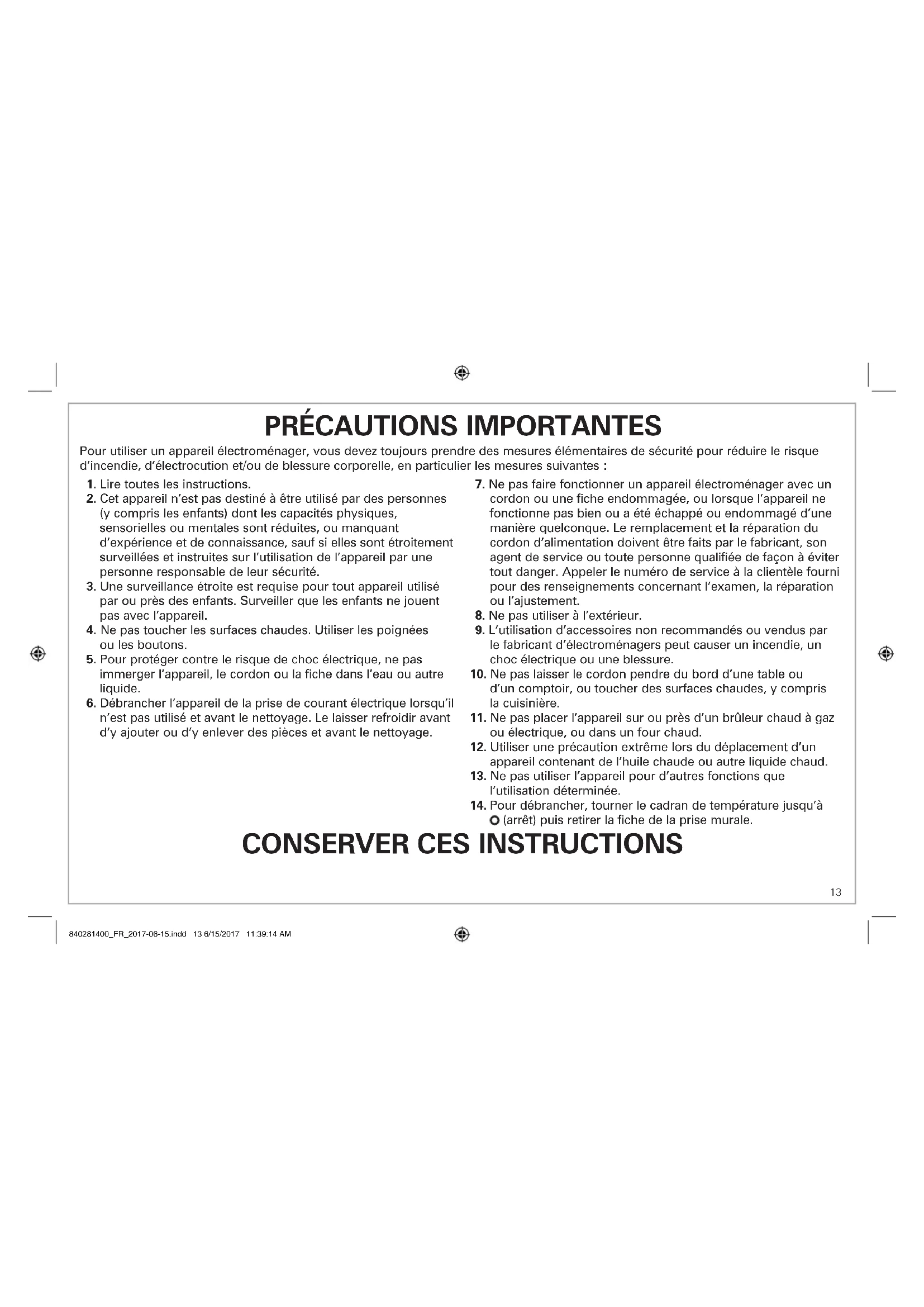 840281400_FR_2017-06-15.indd 13 6/15/2017 11:39:14 AM14 Autres consignes de sécurité pour le consommateur Cet appareil est destiné à un usage domestique uniquement. w AVERTISSEMENT Risque de choc électrique : Cet appareil est fourni avec une fiche polarisée (une broche large) pour réduire le risque d’électrocution. Cette fiche n’entre que dans un seul sens dans une prise polarisée. Ne contrecarrez pas l’objectif sécuritaire de cette fiche en la modifiant de quelque manière que ce soit ou en utilisant un adaptateur. Si vous ne pouvez pas insérer complètement la fiche dans la prise, inversez la fiche. Si elle refuse toujours de s’insérer, faire remplacer la prise par un électricien. La longueur du cordon installé sur cet appareil a été sélectionnée afin de réduire les risques d’enchevêtrement ou de faux pas causés par un fil trop long. L’utilisation d’une rallonge approuvée est permise si le cordon est trop court. Les caractéristiques électriques de la rallonge doivent être équivalentes ou supérieures aux caractéristiques de l’appareil. Prendre toutes les précautions nécessaires pour installer la rallonge de manière à ne pas la faire courir sur le comptoir ou sur une table pour éviter qu’un enfant ne tire sur le cordon ou trébuche accidentellement. Pour éviter la surcharge du circuit électrique, ne pas utiliser un autre appareil à haute puissance sur le même circuit que cet appareil. La rallonge doit être connectée à l’appareil en premier avant de la brancher dans la prise. Toujours utiliser le gril sur une surface plane pour permettre à la graisse et aux huiles de bien s’écouler. Nettoyer avec précaution toute graisse chaude renversée. Prendre des précautions lors de la cuisson et en présence d’éclaboussements de graisse. Toujours utiliser le ramasse-gouttes et s’assurer qu’il repose sur le comptoir et directement sous le gril avant son utilisation. Jamais déplacer le grill pendant l’utilisation. Débrancher le gril et le laisser refroidir avant de le déplacer. Toujours utiliser une mitaine de four pour se protéger la main avant d’ouvrir l’appareil. w ATTENTION Risque de brûlures : La vapeur qui s’échappe peut causer des brûlures. 840281400_FR_2017-06-15.indd 14 6/15/2017 11:39:14 AM15 Pièces et caractéristiques *Pour commander des pièces : Canada : 1.800.267.2826 AVANT LA PREMIÈRE UTILISATION : Essuyer les surfaces de cuisson inférieure et supérieure avec un linge humide et de l’eau savonneuse. Rincer le linge et essuyer à nouveau les surfaces puis assécher. Ramasse- gouttes* Couvercle Base Bouton de dégagement de la plaque inférieure Cadran de sélection de cuisson Bouton de déverrouillage Cadran de sélection des températures Plaques de cuisson antiadhésives amovibles/ réversibles* Témoins lumineux Bouton de dégagement de la plaque supérieur ATTENTION : SURFACE CHAUDE. La température des surfaces extérieures sera plus élevée pendant le fonctionnement de l’appareil. 840281400_FR_2017-06-15.indd 15 6/15/2017 11:39:15 AM16 Témoins lumineux Votre gril de contact est doté de deux témoins lumineux. La couleur rouge indique que l’appareil est en marche. Le témoin vert clignotant indique que l’appareil se réchauffe et deviendra fixe lorsque la température de préchauffage est atteinte. Rangement du cordon Bouton de déverrouillage Témoin lumineux rouge en marche Témoin lumineux vert de préchauffage Pièces et caractéristiques (suite) Boutons de dégagement de la plaque 840281400_FR_2017-06-15.indd 16 6/15/2017 11:39:16 AM17 Utilisation du gril w AVERTISSEMENT Risque de brûlures. Toujours utiliser un gant de cuisinier pour protéger les mains au moment de l’ouverture d’un gril chaud. La vapeur dégagée peut causer des brûlures.