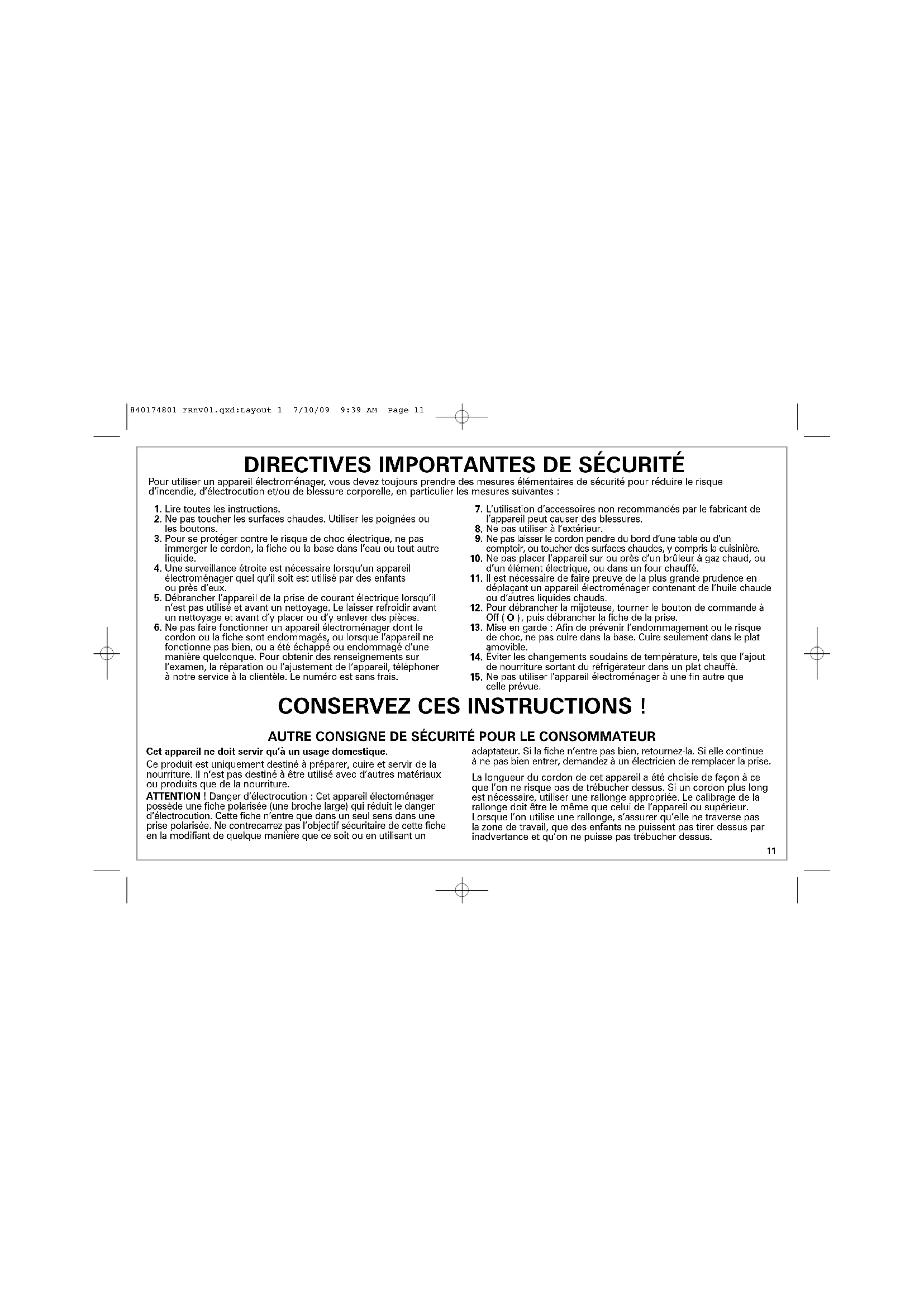 Pour utiliser un appareil électroménager, vous devez toujours prendre des mesures élémentaires de sécurité pour réduire le risque d’incendie, d’électrocution et/ou de blessure corporelle, en particulier les mesures suivantes : CONSERVEZ CES INSTRUCTIONS ! AUTRE CONSIGNE DE SÉCURITÉ POUR LE CONSOMMATEUR 840174801 FRnv01.qxd:Layout 1 7/10/09 9:39 AM Page 1112 COUVERCLE ET POT: PRÉCAUTIONS ET INFORMATION