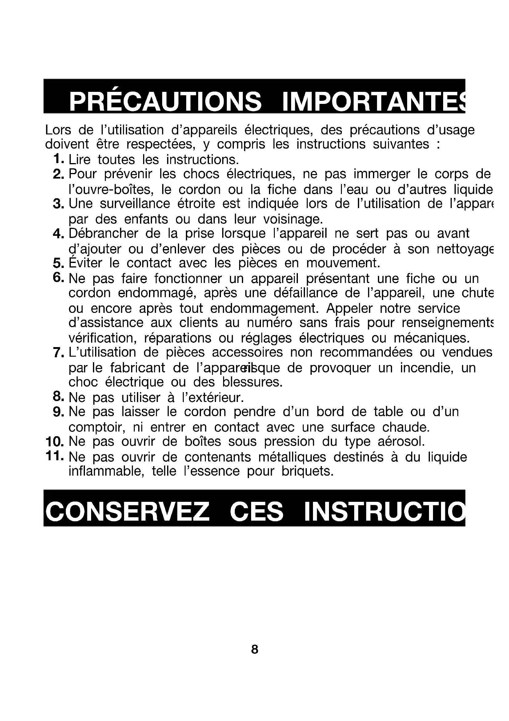 Pour prévenir les chocs électriques, ne pas immerger le corps de l’ouvre-boîtes, le cordon ou la fiche dans l’eau ou d’autres liquides.