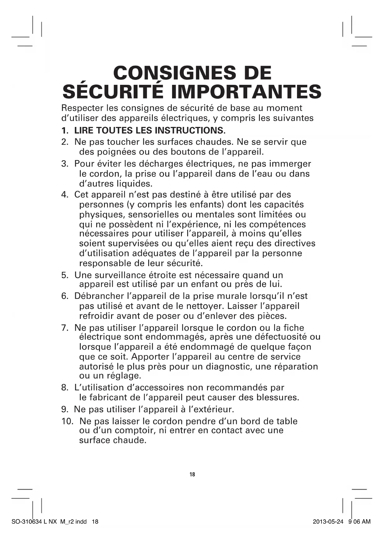immédiatement tous les boutons de réglage (OFF/LOW/ HIGH/WARM – arrêt, température basse, température élevée et réchaud) à la position d’arrêt (OFF), puis retirer la che de la prise de courant. Ne pas utiliser ni tenter de réparer l’appareil défectueux. SO-310634 L NX M_r2 indd 20 2013-05-24 9 06 AM21