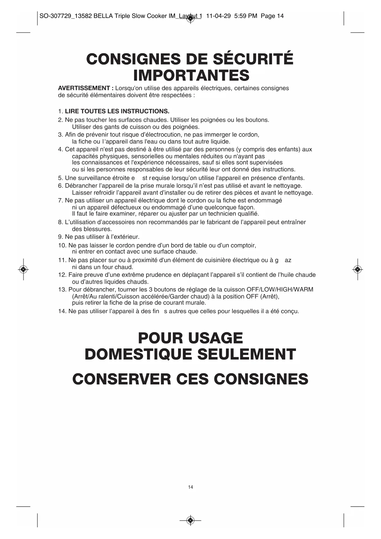 SO-307729_13582 BELLA Triple Slow Cooker IM_Layout 1 11-04-29 5:59 PM Page 14CONSIGNES DE SÉCURITÉ IMPORTANTES ADDITIONNELLES MISE EN GARDE, SURFACES CHAUDES : Cet appareil produit de la chaleur et de la vapeur lorsqu'il fonctionne. Prendre les précautions d’usage afin de prévenir les risques de brûlures, d’incendie ou autres blessures et des dommages matériels. MISE EN GARDE : Cet appareil devient chaud pendant son utilisation et demeure chaud pendant quelque temps lorsqu'il est éteint. Toujours utiliser des gants isolants lorsqu’on manipule des objets chauds et laisser aux parties métalliques le temps de refroidir avant de nettoyer l'appareil. Ne placer aucun objet sur le dessus de l’appareil lorsqu'il est en marche ou lorsqu'il est chaud.