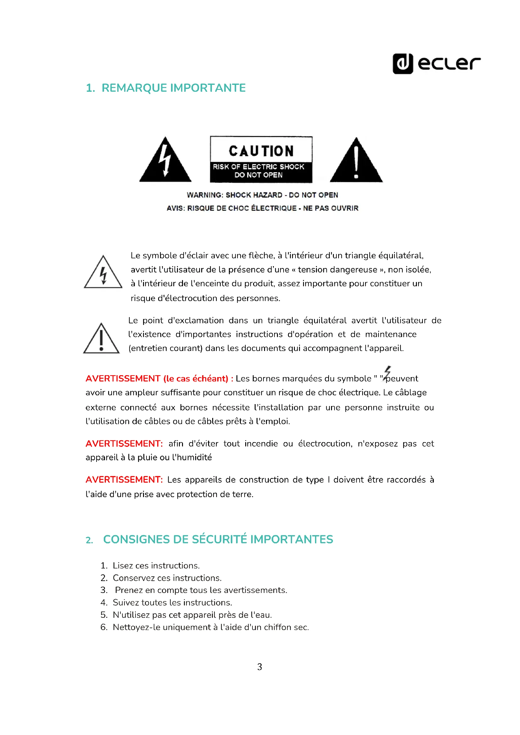 Toutes les caractéristiques du produit sont susceptibles de varier en raison des tolérances de fabrication. NEEC AUDIO BARCELONA S.L. se réserve le droit d'apporter à la conception ou à la fabrication des modifications ou améliorations qui peuvent affecter les caractéristiques de ce produit. Pour des questions techniques, contactez votre fournisseur, distributeur ou remplissez le formulaire de contact sur notre site Internet, dans Support / Technical requests. Motors, 166‐168 08038 Barcelone ‐ Espagne ‐ (+34) 932238403 | information@ecler.com | www.ecler.com