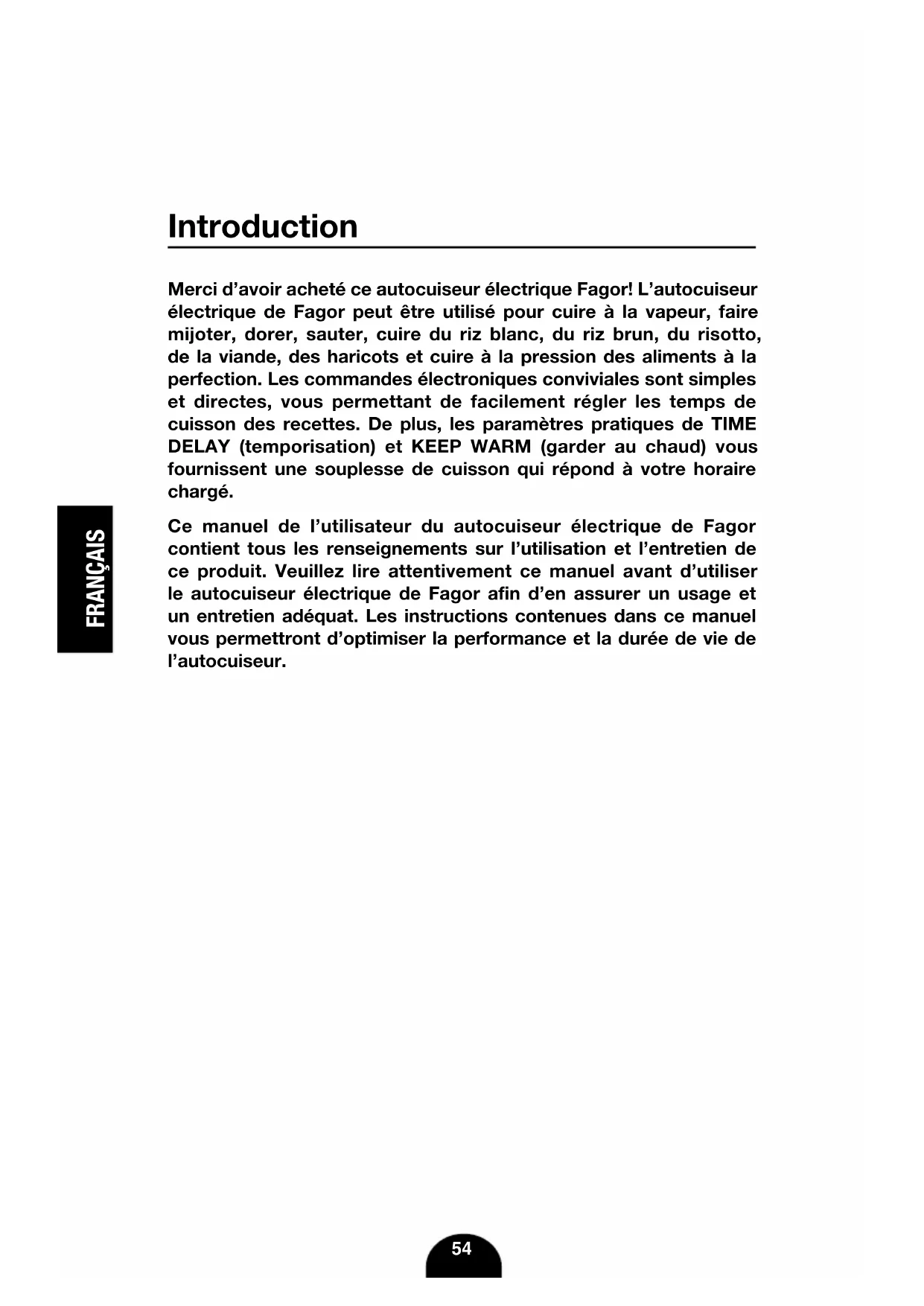 Introduction Merci d’avoir acheté ce autocuiseur électrique Fagor! L’autocuiseur électrique de Fagor peut être utilisé pour cuire à la vapeur, faire mijoter, dorer, sauter, cuire du riz blanc, du riz brun, du risotto, de la viande, des haricots et cuire à la pression des aliments à la perfection. Les commandes électroniques conviviales sont simples et directes, vous permettant de facilement régler les temps de cuisson des recettes. De plus, les paramètres pratiques de TIME DELAY (temporisation) et KEEP WARM (garder au chaud) vous fournissent une souplesse de cuisson qui répond à votre horaire chargé. Ce manuel de l’utilisateur du autocuiseur électrique de Fagor contient tous les renseignements sur l’utilisation et l’entretien de ce produit. Veuillez lire attentivement ce manuel avant d’utiliser le autocuiseur électrique de Fagor afin d’en assurer un usage et un entretien adéquat. Les instructions contenues dans ce manuel vous permettront d’optimiser la performance et la durée de vie de l’autocuiseur.FRANÇAIS