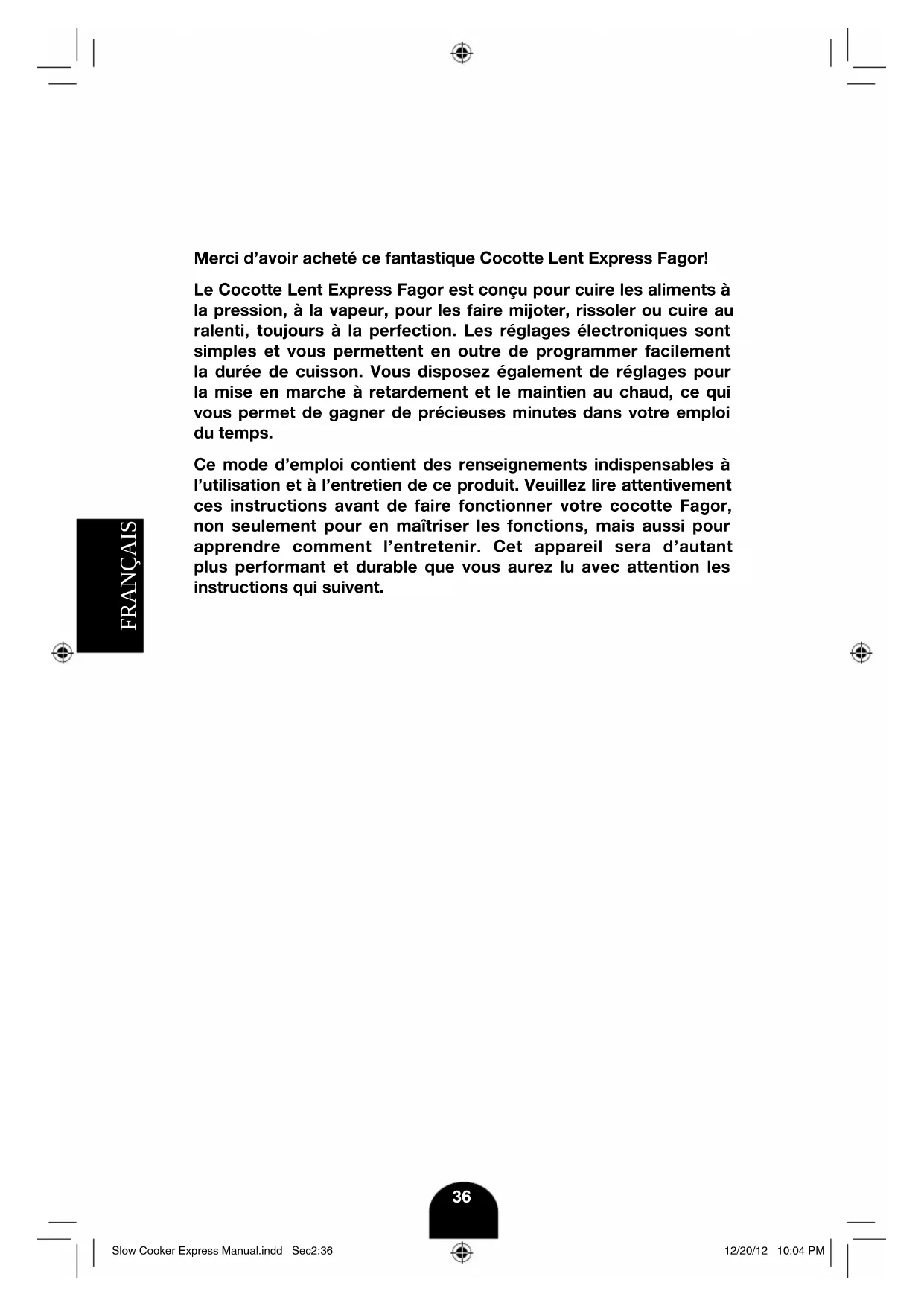 Merci d’avoir acheté ce fantastique Cocotte Lent Express Fagor! Le Cocotte Lent Express Fagor est conçu pour cuire les aliments à la pression, à la vapeur, pour les faire mijoter, rissoler ou cuire au ralenti, toujours à la perfection. Les réglages électroniques sont simples et vous permettent en outre de programmer facilement la durée de cuisson. Vous disposez également de réglages pour la mise en marche à retardement et le maintien au chaud, ce qui vous permet de gagner de précieuses minutes dans votre emploi du temps. Ce mode d’emploi contient des renseignements indispensables à l’utilisation et à l’entretien de ce produit. Veuillez lire attentivement ces instructions avant de faire fonctionner votre cocotte Fagor, non seulement pour en maîtriser les fonctions, mais aussi pour apprendre comment l’entretenir. Cet appareil sera d’autant plus performant et durable que vous aurez lu avec attention les instructions qui suivent. Slow Cooker Express Manual.indd Sec2:36Slow Cooker Express Manual.indd Sec2:36 12/20/12 10:04 PM12/20/12 10:04 PMFRANÇAIS