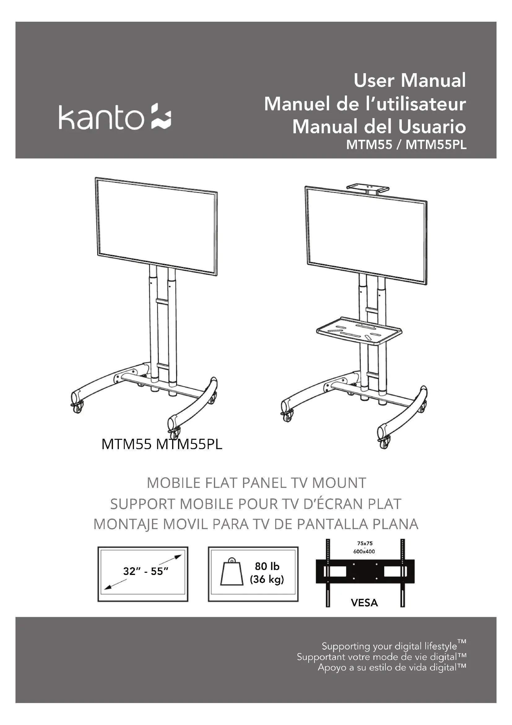 Merci d'avoir choisi un support de téléviseur mobile de Kanto. Le MTM55 est donc pour monter un téléviseur à écran plat, et possède une capacité de charge totale de 80 lb (36 kg). Il peut être utilisé pour monter des téléviseurs jusqu'à 55", est régiable en hauteur jusqu'à 5.2ft (1.6m), et possède des fonctions de blocage des roues. Le MTM55PL comprend également un tiroir d'appareil et une plate-forme de webcam.