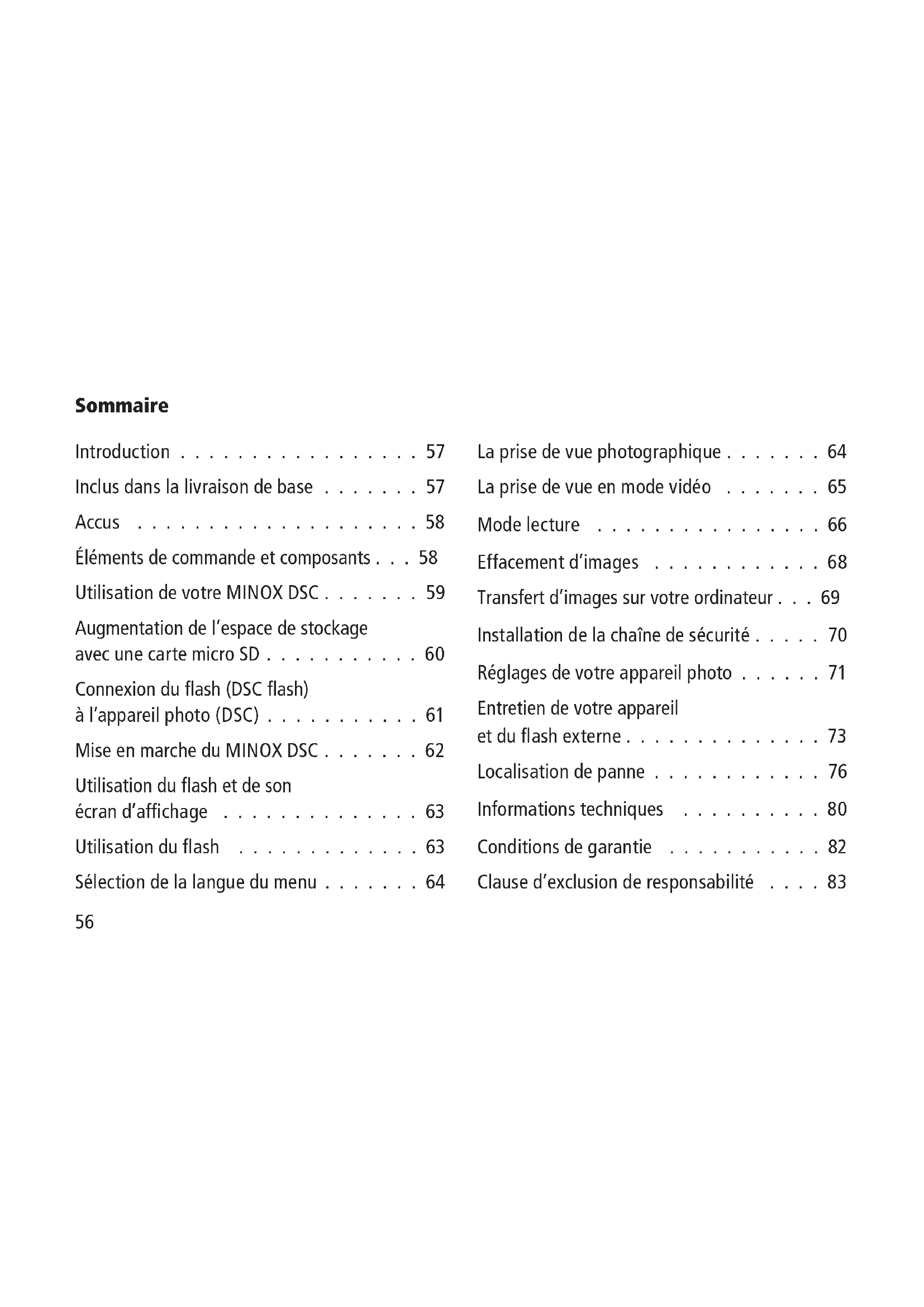 Introduction 57 Inclus dans la livraison de base 57 Accus 58 Éléments de commande et composants 58 Utilisation de votre MINOX DSC. 59 Augmentation de l'espace de stockage avec une carte micro SD 60 Connexion du flash (DSC flash) à l'appareil photo (DSC) 61 Mise en marche du MINOX DSC. 62 Utilisation du flash et de son écran d'affichage 63 Utilisation du flash 63 Sélection de la langue du menu 64